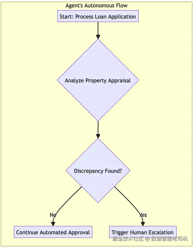 - 触发(Trigger) :LoanApprovalAgent 成功核验了申请人的收入与信用评分。然而在分析房产评估报告时,它检测到评估报告的建筑面积(1,800 sq. ft)与房产税记录(1,500 sq. ft)之间存在显著差异,导致其置信度下降。