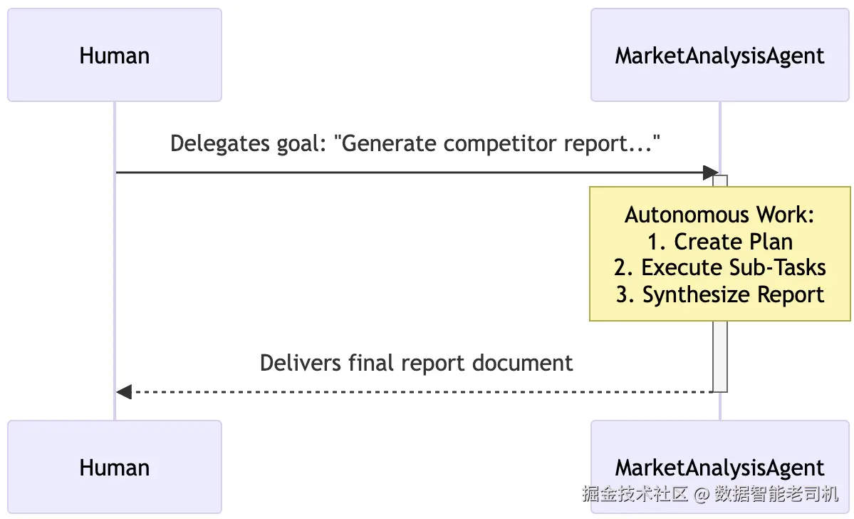 该示例展示了不同交互与委派模式如何串联起来以完成一个复杂用户目标,并在触及系统能力边界时,如何无缝升级以获取人类输入。