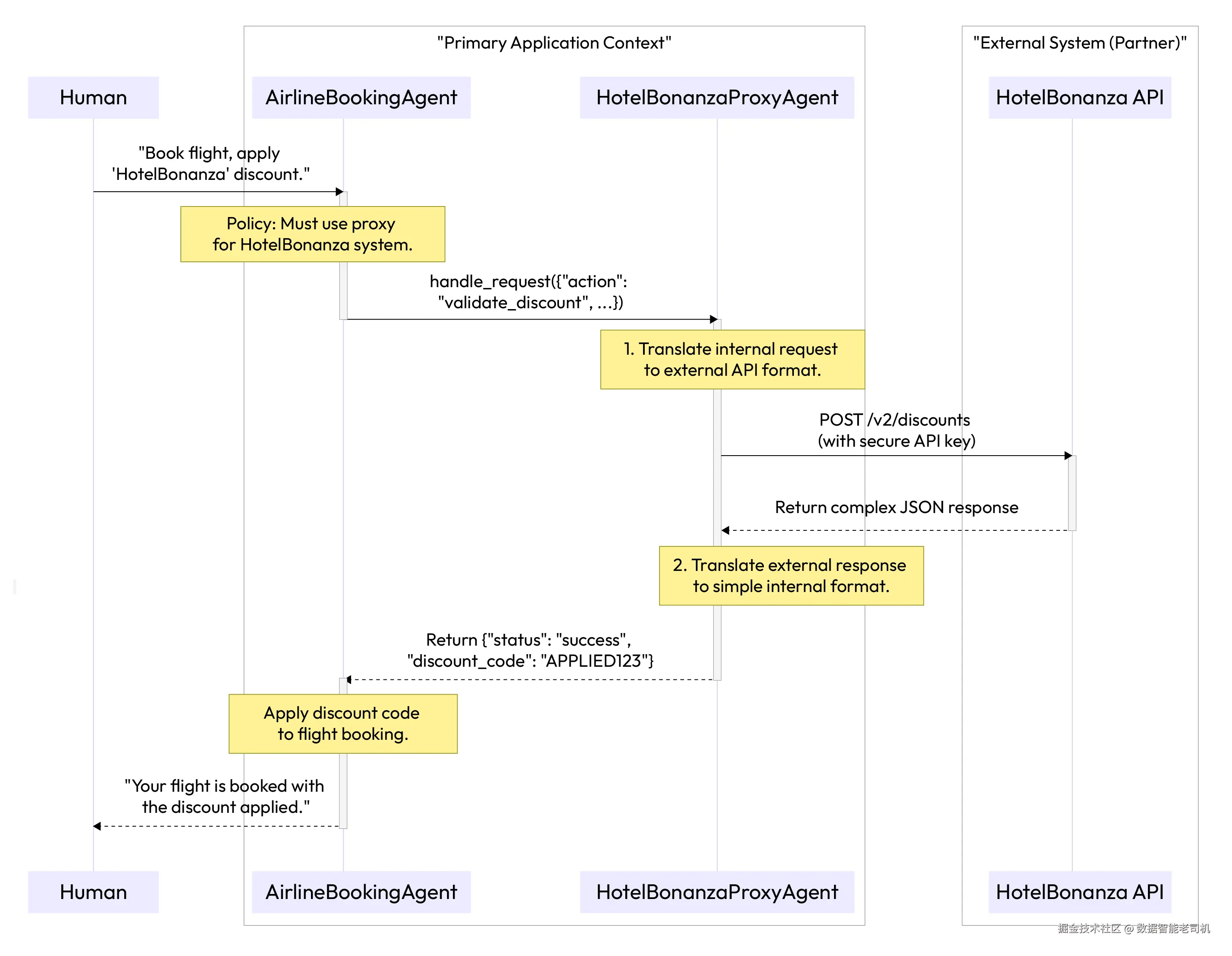 {"action": "validate_discount", "user_id": "user123", "loyalty_code": "HB-XYZ"}。 - proxy 执行(Proxy execution) :HotelBonanzaProxyAgent(唯一持有秘密 API keys 的智能体)接收请求,将其格式化为外部 HotelBonanza 系统所需的具体 API 调用,并安全发送。