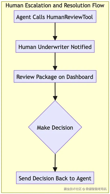 "在评估报告与税务记录之间发现房产面积不一致。需要人类复核以验证房产价值。" - 升级(Escalate) :它调用 HumanReviewTool,将该包推送到人类承保人(underwriter)的工作台(dashboard)。