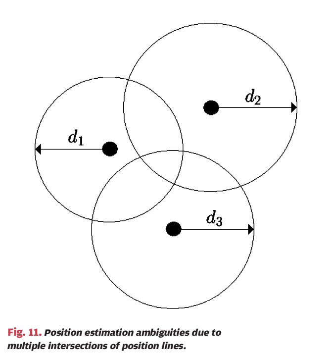 这条式子从处理角度可以理解为:把两路接收波形在时间轴上滑动对齐,使相似度最大的位置就是 TDOA。 *** ** * ** *** ### 6.5 复合参数与 CIR/PDP:当"单个标量参数"不够时,用更丰富的信道指纹 论文还提到混合方案(TOA/AOA、TOA/RSS、TDOA/AOA、TOA/TDOA 等)以及利用多径功率延迟谱(PDP)或信道冲激响应(CIR)作为"位置指纹"的思路:TOA 只把目标限制在一个圆上,而在某些环境里 CIR 形状在空间上更独特,理论上可直接映射到位置;但代价是需要训练数据库且估计复杂度更高。 *** ** * ** *** ## 7. 第二步:由参数到位置(几何、统计、映射) 论文把第二步分成三类:几何/统计(不依赖训练数据库)与 mapping/fingerprinting(依赖训练数据库)。这三类并不是互斥的,更多是"模型驱动"到"数据驱动"的连续谱。 *** ** * ** *** ### 7.1 几何定位:圆、直线、双曲线(Fig.8--Fig.10) #### 图 8:TOA/RSS 的距离约束是"圆",三圆交点给二维位置  图 8 里三个黑点是参考节点,圆半径标成 d1,d2,d3d_1,d_2,d_3d1,d2,d3,灰点是目标位置。每个测距结果都对应一个圆: (x−xi)2+(y−yi)2=di2,i=1,2,3 (x-x_i)\^2+(y-y_i)\^2=d_i\^2,\\quad i=1,2,3 (x−xi)2+(y−yi)2=di2,i=1,2,3 理想无噪声下三圆共点,解就是目标坐标。这就是 trilateration 的几何直觉。 #### 图 9:AOA 的方向约束是"射线",两射线交会即可定位  图 9 中两参考节点分别测得角度 α1,α2\\alpha_1,\\alpha_2α1,α2,于是各自产生一条指向目标的直线(或射线),交点处(灰点)即目标位置。 #### 图 10:TDOA 的几何轨迹是"双曲线",两条双曲线交点定位  图 10 中底部黑点可视为参考节点 000,左右黑点是参考节点 1,21,21,2。与节点 0 的距离差约束 ∥p−pi∥−∥p−p0∥=Δi\\\|p-p_i\\\|-\\\|p-p_0\\\|=\\Delta_i∥p−pi∥−∥p−p0∥=Δi 形成双曲线,两条双曲线交会于灰点给出目标位置。论文提醒:TDOA 可能存在几何条件不良导致的非唯一解,这与节点布局有关。 ### 7.2 图 11:噪声一来,"交点"变成"交叉区域",几何法缺乏系统融合规则  图 11 仍然画了三个圆(对应三次测距),但由于测量带噪,圆不再在单点精确相交,交叉区域出现多个可能交点或干脆无公共交点。几何法在无噪声时非常直观,但在有噪声时缺少一个"最合理的选择原则",也缺少一种自然的"多测量融合机制"。 *** ** * ** *** ### 7.3 统计建模:把问题写成 zi=fi(x,y)+ηiz_i=f_i(x,y)+\\eta_izi=fi(x,y)+ηi(式 (15)--(17)) 为系统处理噪声与融合多测量,作者给出统一观测模型: zi=fi(x,y)+ηi,i=1,...,Nm(15) z_i=f_i(x,y)+\\eta_i,\\quad i=1,\\dots,N_m \\tag{15} zi=fi(x,y)+ηi,i=1,...,Nm(15) 其中 ziz_izi 是测得的参数(通常把时间乘以 ccc 换成距离来统一量纲),fi(x,y)f_i(x,y)fi(x,y) 是在位置 (x,y)(x,y)(x,y) 下的"真值函数",ηi\\eta_iηi 是测量噪声。不同参数类型的 fif_ifi 在文中写为: fi(x,y)={(x−xi)2+(y−yi)2,TOA/RSStan−1 (y−yix−xi),AOA(x−xi)2+(y−yi)2−(x−x0)2+(y−y0)2,TDOA(16) f_i(x,y)= \\begin{cases} \\sqrt{(x-x_i)\^2+(y-y_i)\^2}, \& \\text{TOA/RSS}\\\\\[4pt\] \\tan\^{-1}\\!\\left(\\dfrac{y-y_i}{x-x_i}\\right), \& \\text{AOA}\\\\\[8pt\] \\sqrt{(x-x_i)\^2+(y-y_i)\^2}-\\sqrt{(x-x_0)\^2+(y-y_0)\^2}, \& \\text{TDOA} \\end{cases} \\tag{16} fi(x,y)=⎩ ⎨ ⎧(x−xi)2+(y−yi)2 ,tan−1(x−xiy−yi),(x−xi)2+(y−yi)2 −(x−x0)2+(y−y0)2 ,TOA/RSSAOATDOA(16) 向量形式: z=f(x,y)+η(17) \\mathbf z=\\mathbf f(x,y)+\\boldsymbol\\eta \\tag{17} z=f(x,y)+η(17) 作者进一步把统计方法分为 parametric 与 nonparametric:前者假设噪声 pdf 形式已知(可能带未知参数),后者不假设 pdf 形式,只利用一些一般性质(如方差、对称性)或直接用训练数据驱动。 *** ** * ** *** ### 7.4 Bayes 与 ML:式 (18)--(21) 给出统一的"该优化什么"的答案 设未知参数向量为 Θ=\[x y ΛT\]T \\Theta=\[x\\ \\ y\\ \\ \\Lambda\^T\]\^T Θ=\[x y ΛT\]T 其中 Λ\\LambdaΛ 表示噪声分布可能的未知参数(方差、偏置等)。若存在先验 π(Θ)\\pi(\\Theta)π(Θ),常见贝叶斯估计包括 MMSE 与 MAP: Θ\^MMSE=E{Θ∣z}(18) \\hat\\Theta_{\\mathrm{MMSE}}=\\mathbb E\\{\\Theta\|\\mathbf z\\} \\tag{18} Θ\^MMSE=E{Θ∣z}(18) Θ\^MAP=argmaxΘp(z∣Θ) π(Θ)(19) \\hat\\Theta_{\\mathrm{MAP}}=\\arg\\max_{\\Theta} p(\\mathbf z\|\\Theta)\\,\\pi(\\Theta) \\tag{19} Θ\^MAP=argΘmaxp(z∣Θ)π(Θ)(19) 若无先验,则 ML: Θ\^ML=argmaxΘp(z∣Θ)(20) \\hat\\Theta_{\\mathrm{ML}}=\\arg\\max_{\\Theta} p(\\mathbf z\|\\Theta) \\tag{20} Θ\^ML=argΘmaxp(z∣Θ)(20) 并用"噪声 pdf"写似然: p(z∣Θ)=pη(z−f(x,y) ∣ Θ)(21) p(\\mathbf z\|\\Theta)=p_{\\boldsymbol\\eta}(\\mathbf z-\\mathbf f(x,y)\\,\|\\,\\Theta) \\tag{21} p(z∣Θ)=pη(z−f(x,y)∣Θ)(21) 一旦噪声模型确定,目标函数就确定。 *** ** * ** *** ### 7.5 高斯独立噪声下的 NLS:式 (22)--(25) 把融合写成加权最小二乘 论文给出一个代表性推导(Example 1)。若噪声分量独立: p(z∣Θ)=∏i=1Nmpηi(zi−fi(x,y))(22) p(\\mathbf z\|\\Theta)=\\prod_{i=1}\^{N_m} p_{\\eta_i}\\bigl(z_i-f_i(x,y)\\bigr) \\tag{22} p(z∣Θ)=i=1∏Nmpηi(zi−fi(x,y))(22) 若每个噪声是零均值高斯且方差已知: pηi(n)=12πσiexp (−n22σi2)(23) p_{\\eta_i}(n)=\\frac{1}{\\sqrt{2\\pi}\\sigma_i}\\exp\\!\\left(-\\frac{n\^2}{2\\sigma_i\^2}\\right) \\tag{23} pηi(n)=2π σi1exp(−2σi2n2)(23) 代入得: p(z∣Θ)∝exp (−∑i=1Nm(zi−fi(x,y))22σi2)(24) p(\\mathbf z\|\\Theta) \\propto \\exp\\!\\left( -\\sum_{i=1}\^{N_m}\\frac{(z_i-f_i(x,y))\^2}{2\\sigma_i\^2} \\right) \\tag{24} p(z∣Θ)∝exp(−i=1∑Nm2σi2(zi−fi(x,y))2)(24) 因此 ML 等价于最小化加权残差平方和: ##