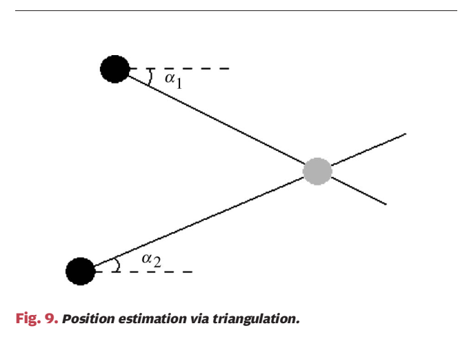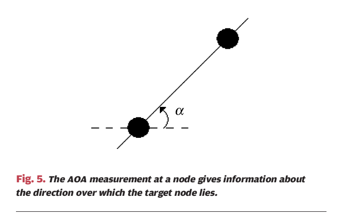 图 5 中下方节点测得入射方向与参考水平线的夹角 α\alphaα,于是目标只能在该方向的射线上。这是 AOA 的基本几何意义:单个角度不足以唯一定位(二维至少两角交会),但它能提供强约束,尤其当距离信息不可靠时。