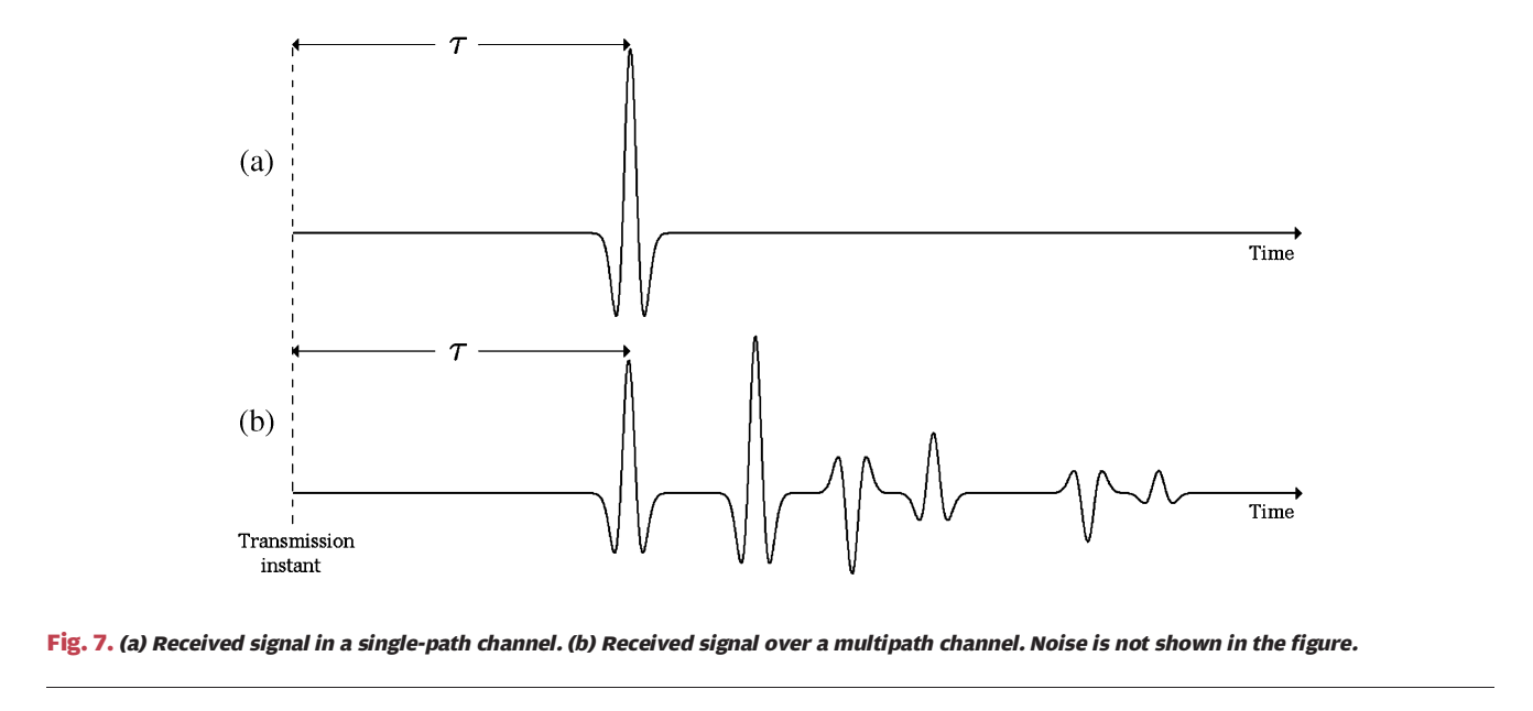 图 7(a) 画的是单径接收:从"Transmission instant"(左侧虚线处)到达一个主要脉冲,图上用箭头标注其延迟 τ\tauτ。图 7(b) 则画出多径:在首径之后出现多组反射/散射脉冲,其中某些后续分量可能幅度更大。若仍用 (12) 的"最大相关峰"做 TOA,极可能选到较强但更晚的路径,导致距离估计偏大。论文因此强调 UWB 场景里常见的 first-path detection(首径检测):目标不是找最大峰,而是尽可能找"最早可可靠检测到的路径"。