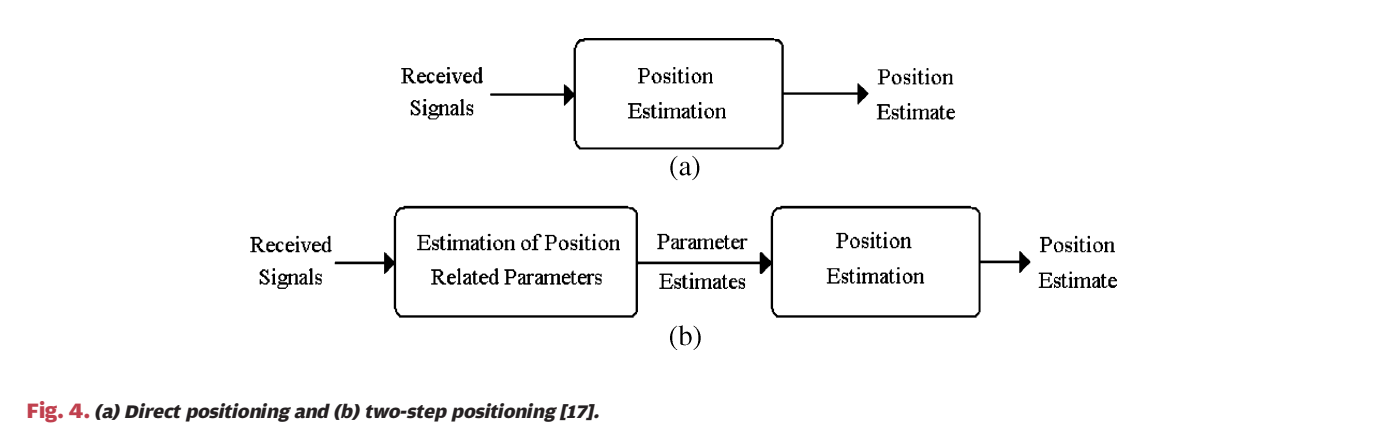 图 4(a) 只有一块:Received Signals → Position Estimation → Position Estimate,代表直接从原始接收波形推断坐标。图 4(b) 则是 Received Signals → Estimation of Position Related Parameters → Parameter Estimates → Position Estimation → Position Estimate,代表先把波形压缩成少量"位置相关参数"(RSS、AOA、TOA...),再用几何/统计方法融合成坐标。