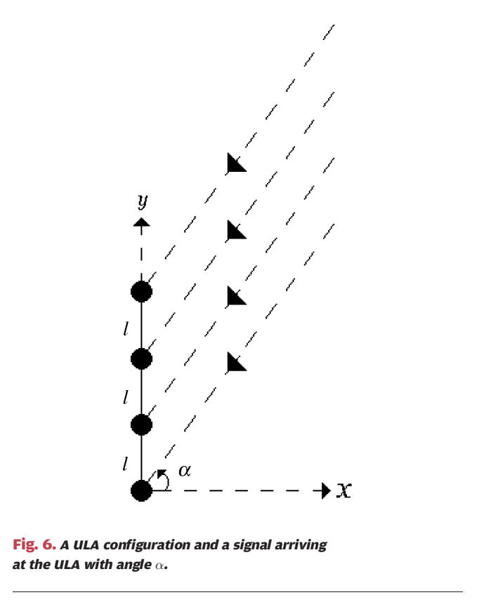 图 6 左侧是一列阵元沿 yyy 轴排列,相邻间距标为 lll。右侧斜虚线表示入射平面波的波前,黑色三角箭头表示传播方向;角度 α\alphaα 是传播方向与 xxx 轴之间的夹角。由于几何投影,相邻阵元的路径差为 lsinαl\sin\alphalsinα,因此相邻阵元的到达时间差为