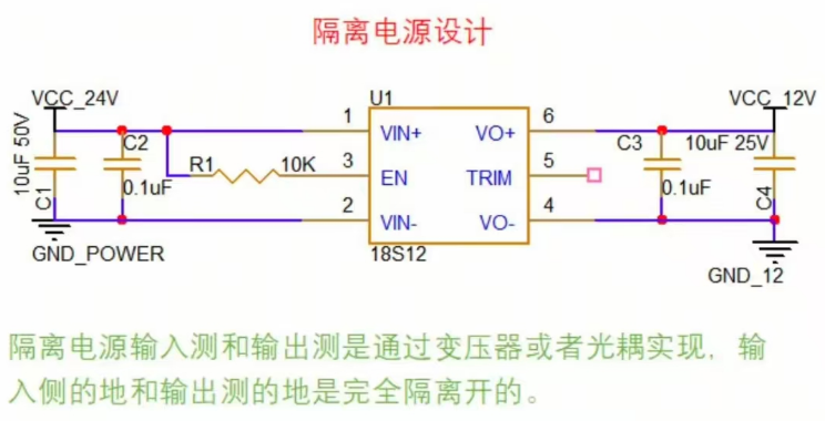 这是一个基于 ** 隔离式 DC-DC 电源模块(18S12)** 的电源转换电路,核心作用是将 24V 非隔离电源转换为 12V 隔离电源,实现输入输出侧的电气完全隔离,避免地环路干扰与高压串扰。