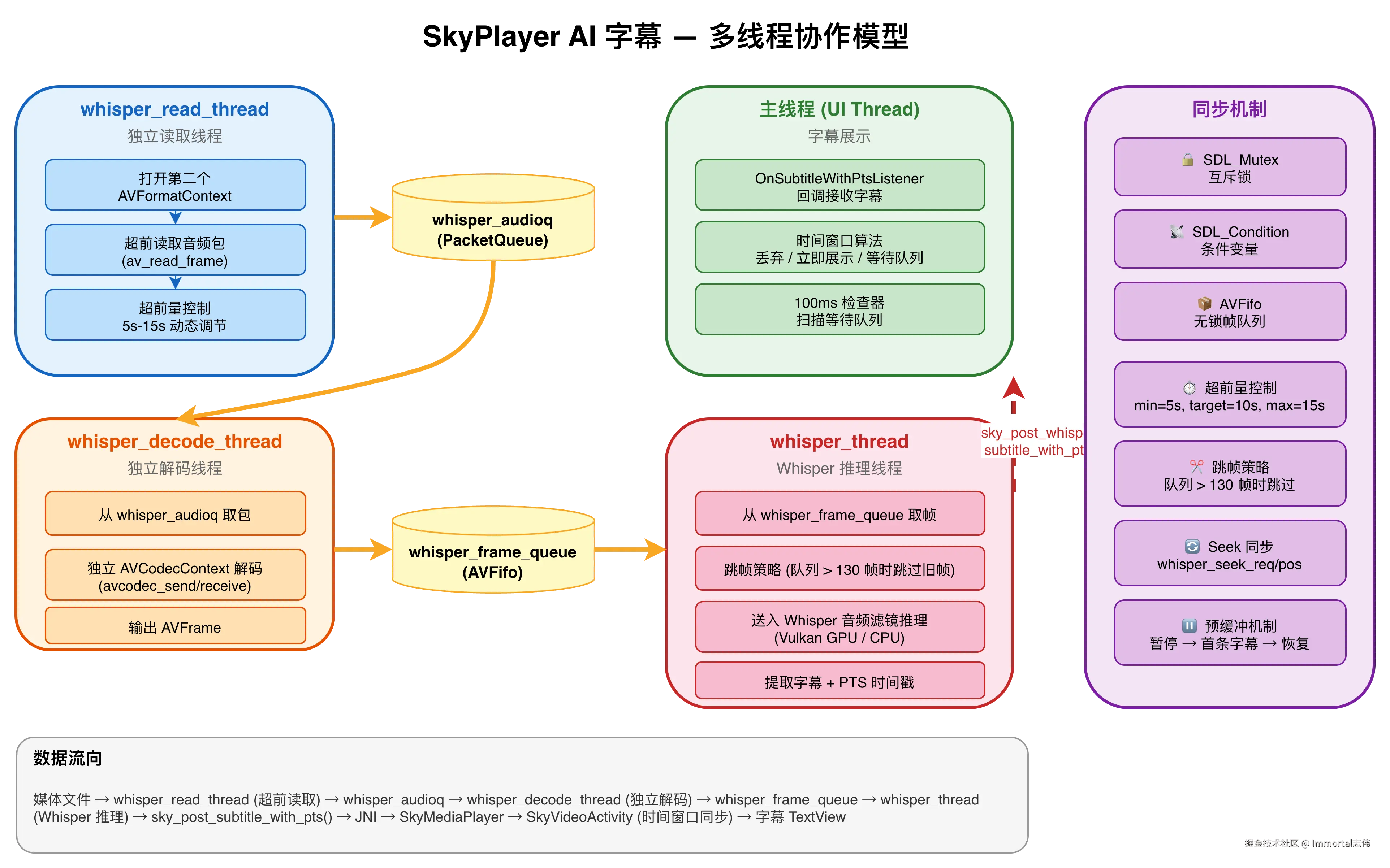 一句话总结 :Whisper 使用独立的读取线程和解码线程,与主播放解码完全分离,始终超前播放位置 5-15 秒解码音频,确保字幕提前生成,再通过时间窗口算法精确同步展示。