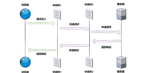 - 最终请求到达 最先注册的中间件(内层),然后交给路由处理程序。