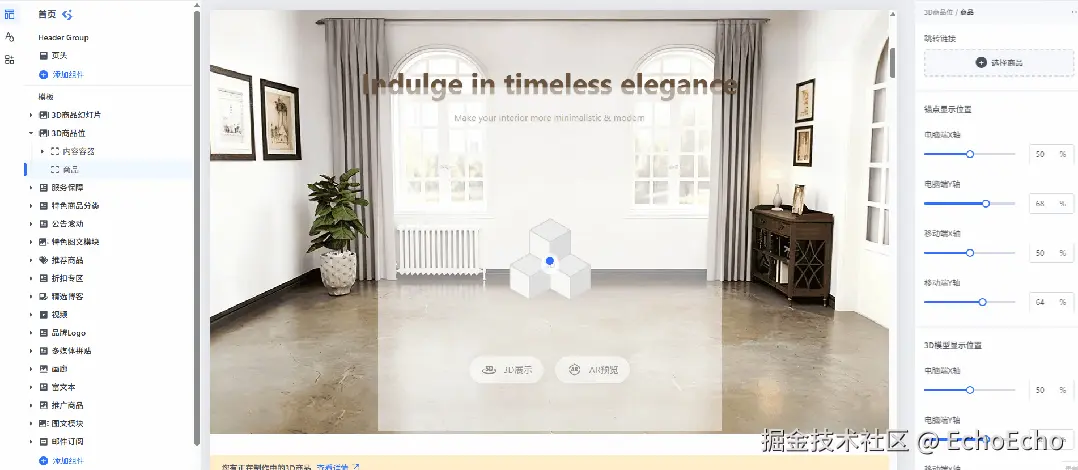 启动项目后,可以在编辑器中可以对该组件进行相关设置和修改。当切换选中内容时,页面会自动滚动,将选中组件显示到浏览器视口中,修改对应属性也会重新渲染对应组件。