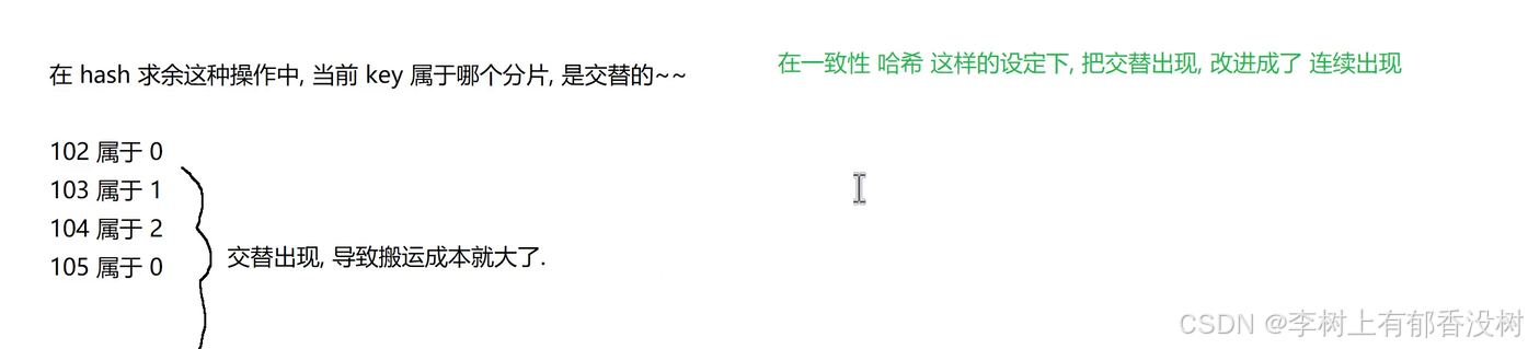 当引⼊⼀个新的分⽚, N 从 3 => 4 时, ⼤量的 key 都需要重新映射. (某个key % 3 和 % 4 的结果不⼀样,就映射到不同机器上了).