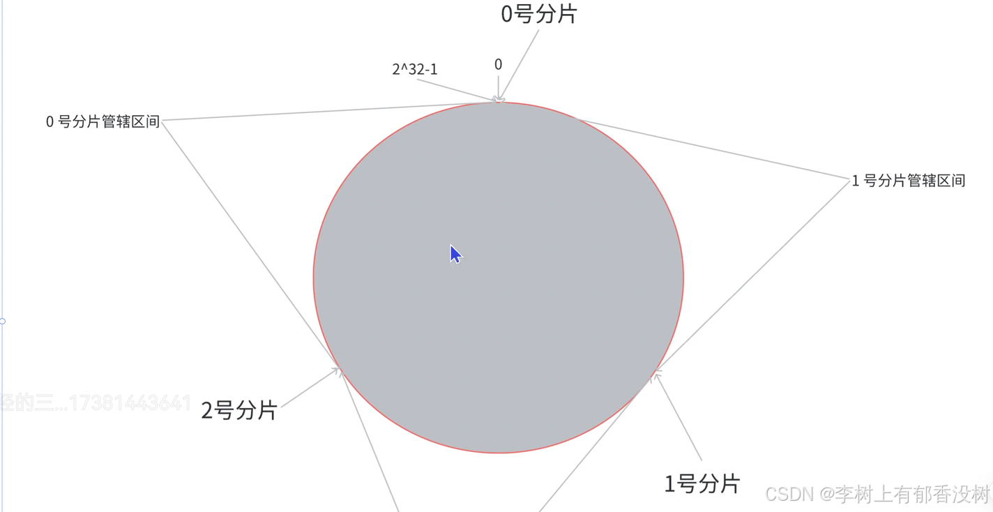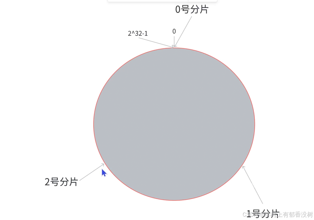 这就相当于, N 个分⽚的位置, 把整个圆环分成了 N 个管辖区间. Key 的 hash 值落在某个区间内, 就归对应区间管理