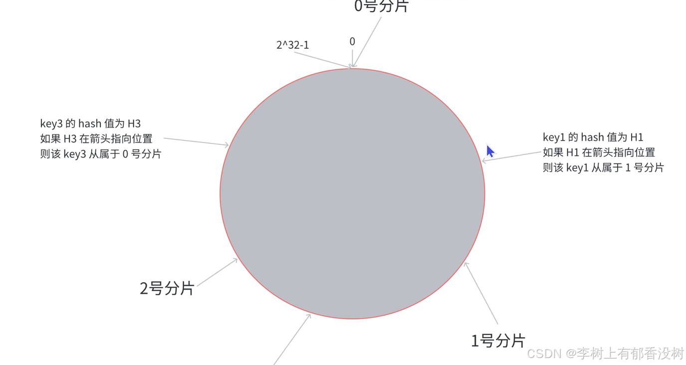 第三步, 假定有⼀个 key, 计算得到 hash 值 H, 那么这个 key 映射到哪个分⽚呢? 规则很简单, 就是从 H所在位置, 顺时针往下找, 找到的第⼀个分⽚, 即为该 key 所从属的分⽚