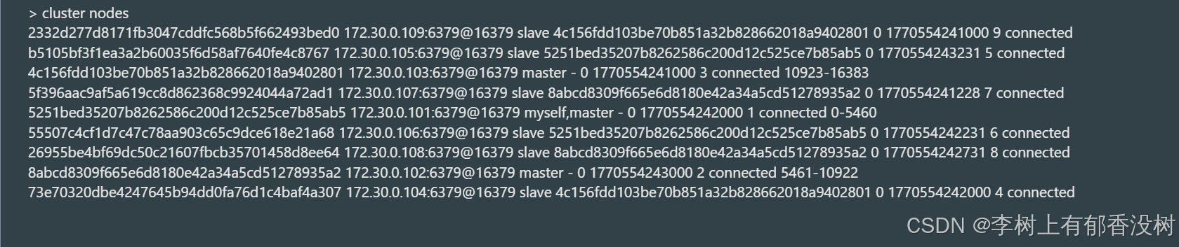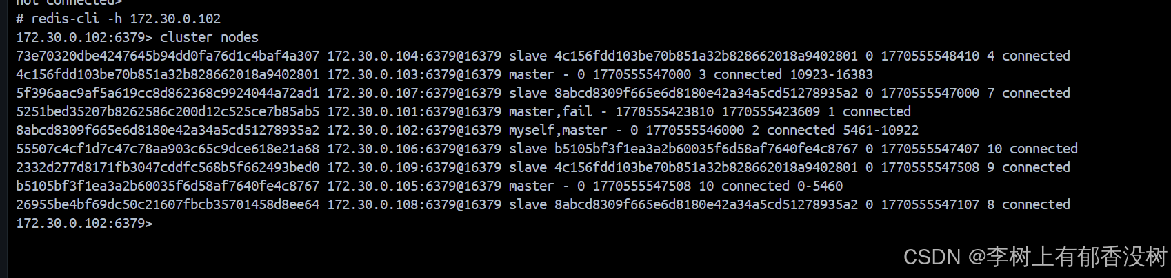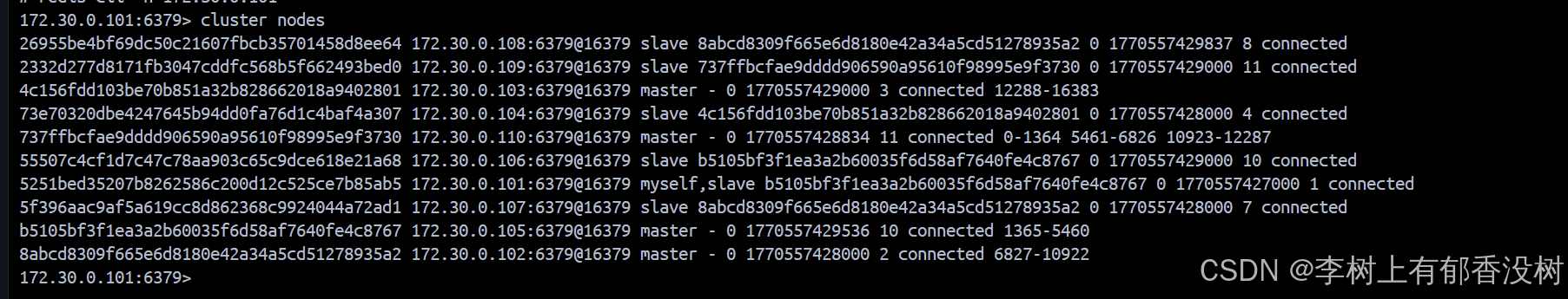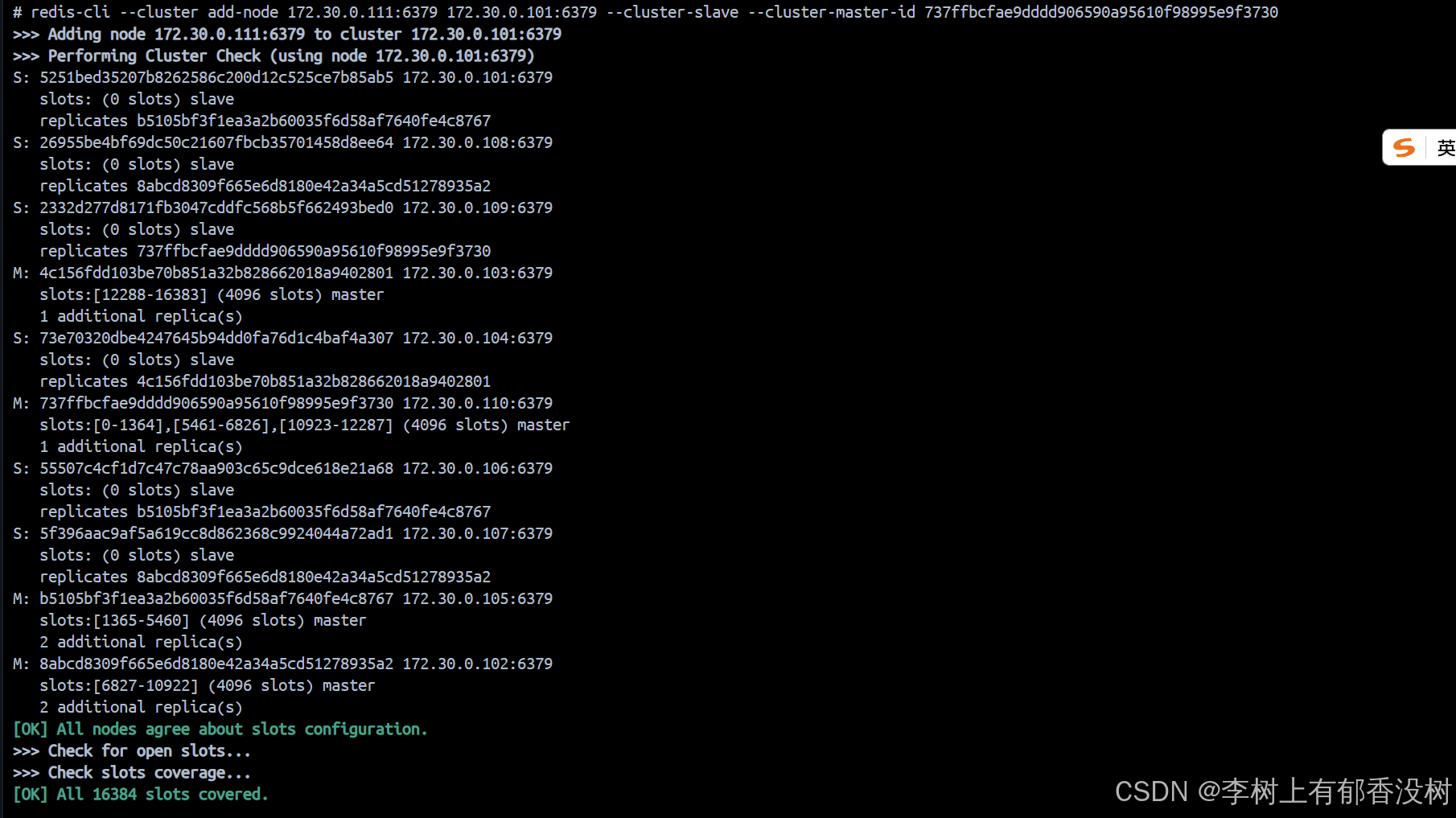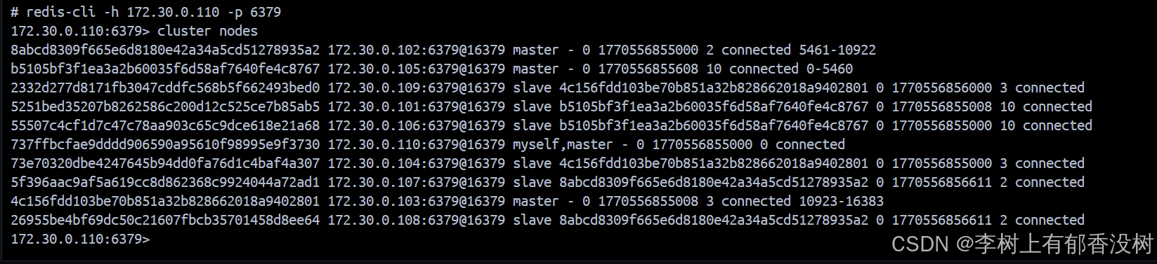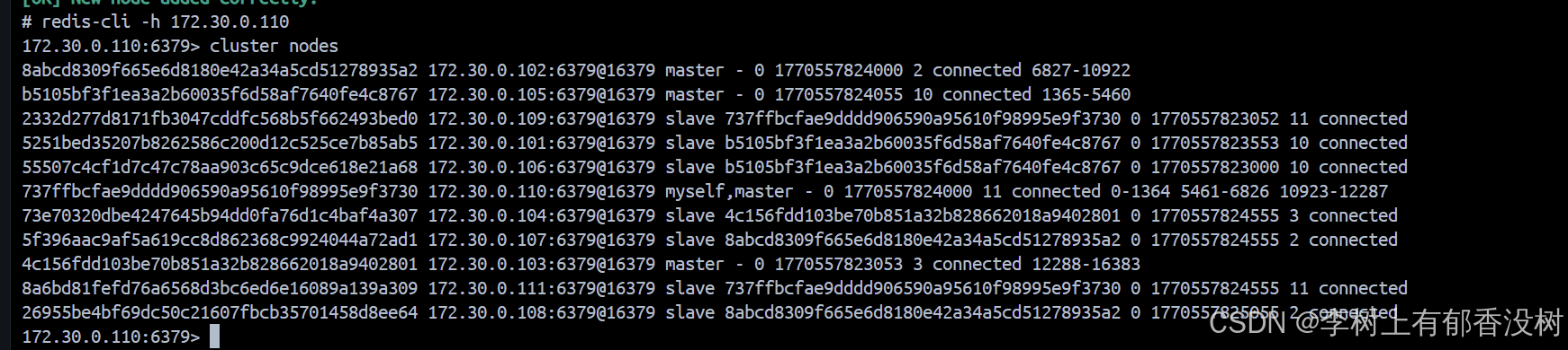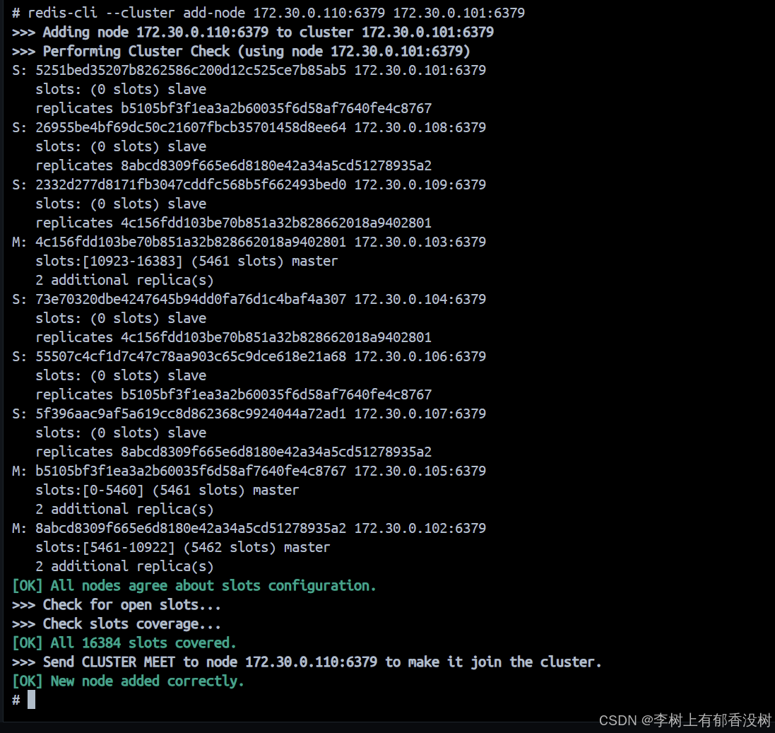 redis-cli --cluster add-node 172.30.0.111:6379 172.30.0.101:6379 --cluster-slave --cluster-master-id [172.30.1.110 节点的 nodeId]