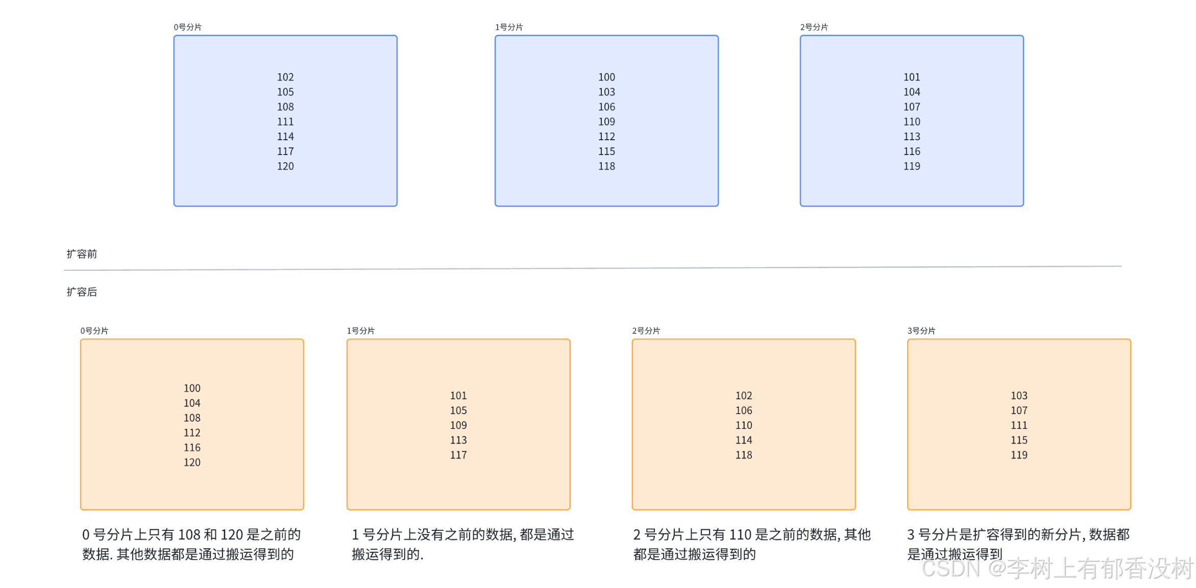 此时, 只需要把 0 号分⽚上的部分数据, 搬运给 3 号分⽚即可. 1 号分⽚和 2 号分⽚管理的区间都是不变的.