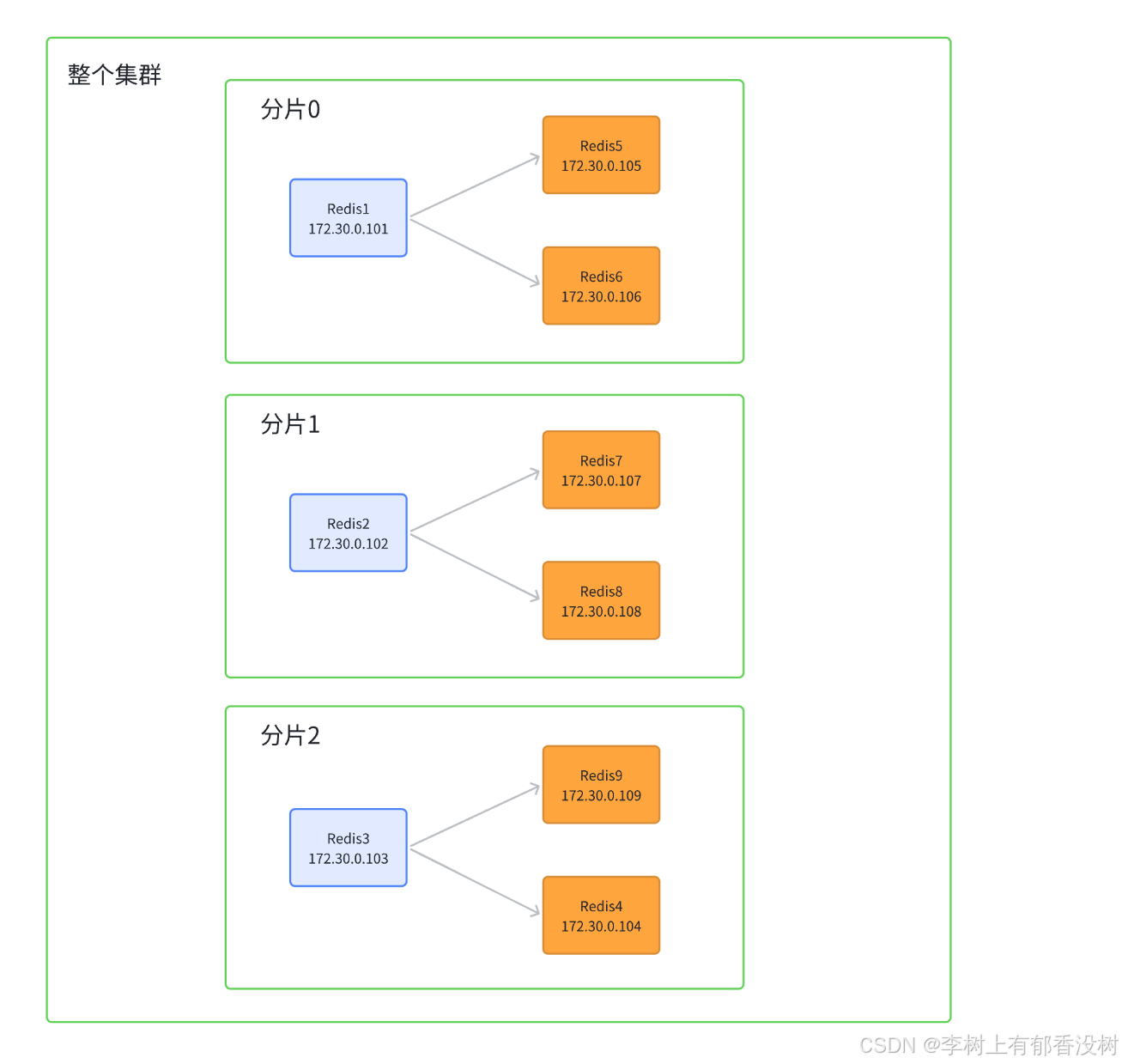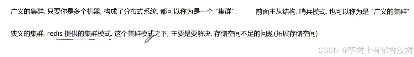 Redis 的集群就是在上述的思路之下, 引⼊多组 Master / Slave , 每⼀组 Master / Slave 存储数据全集的⼀部分, 从⽽构成⼀个更⼤的整体, 称为 Redis 集群 (Cluster).