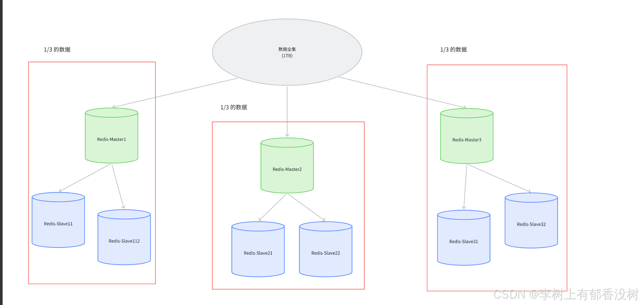 假定整个数据全集是 1 TB, 引⼊三组 Master / Slave 来存储. 那么每⼀组机器只需要存储整个数据全集的 1/3 即可