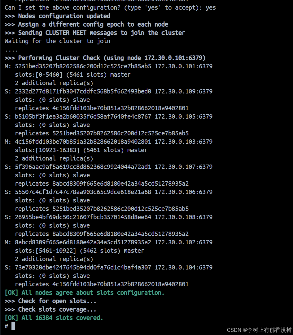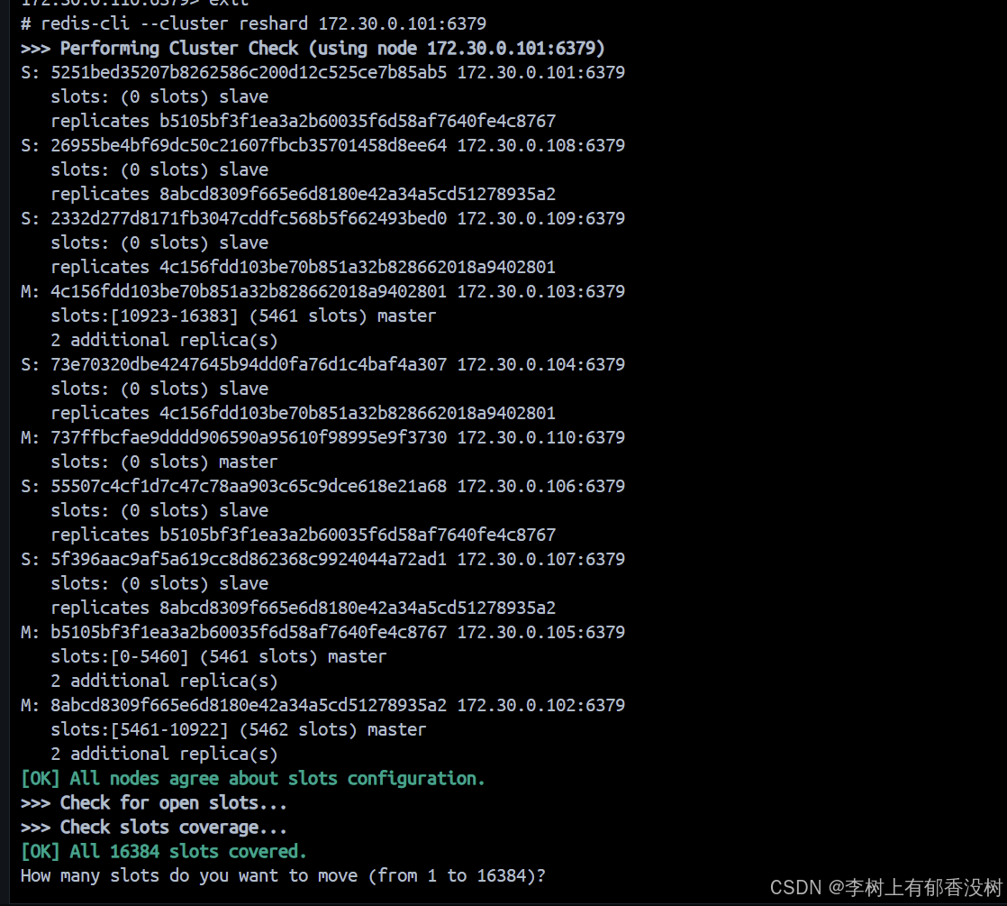 此时查看集群状态, 可以看到 110 节点已经不再持有 slots 了.