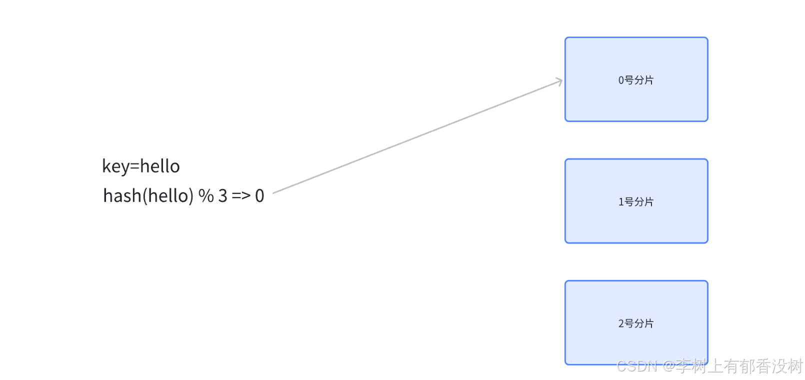 bc4b2a76b9719d91 , 再把这个结果 % 3, 结果为 0, 那么就把 hello 这个 key 放到 0 号分⽚上.