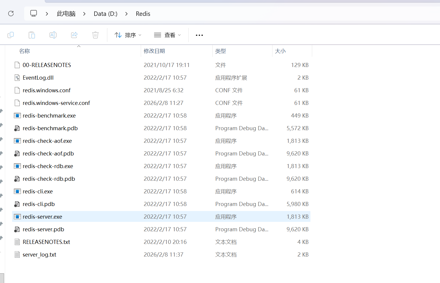 将下载的压缩包解压到指定的文件夹中,这里我在D盘创建Redis文件夹, 安装到D:\Redis ,内容如下: