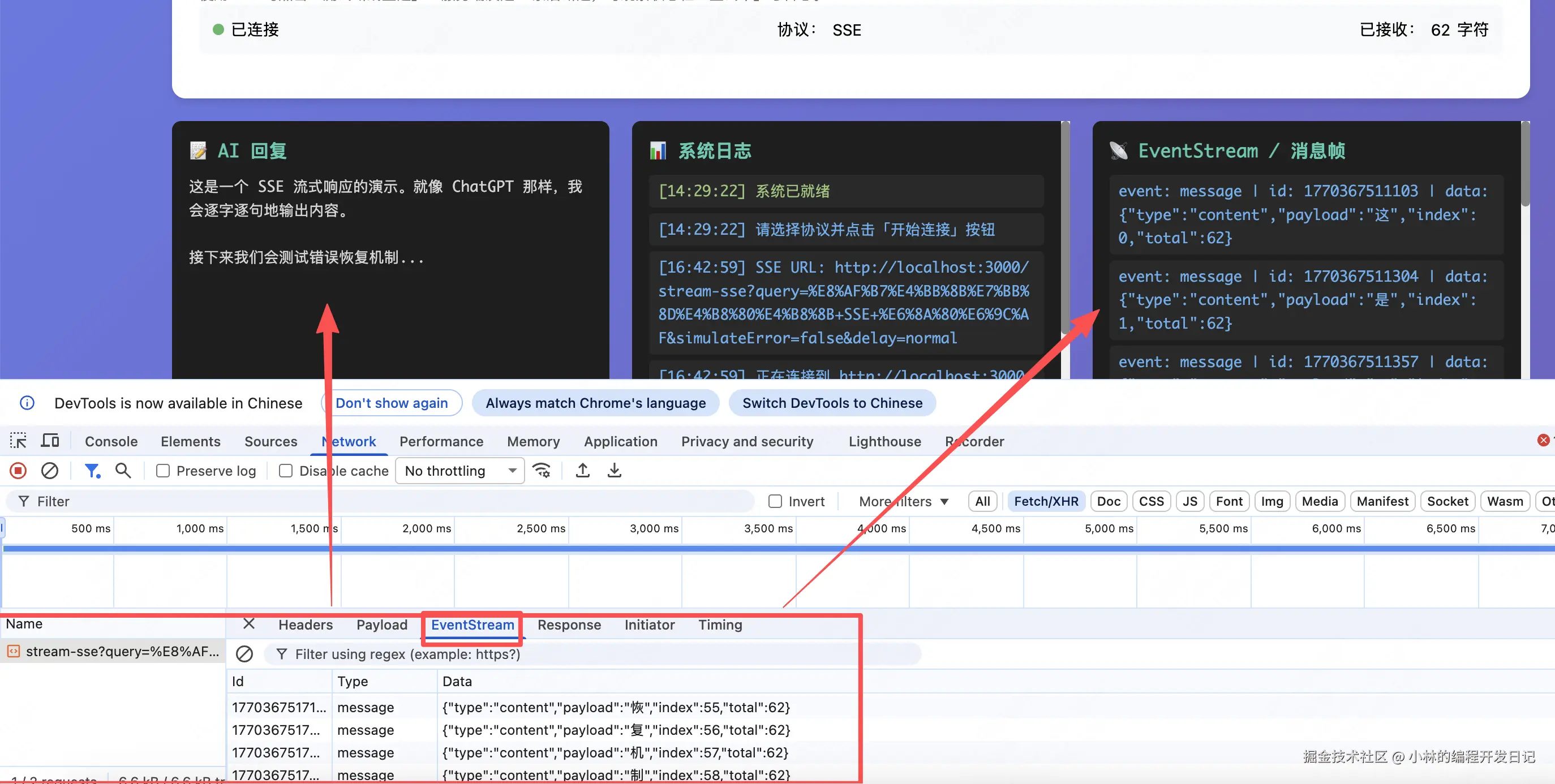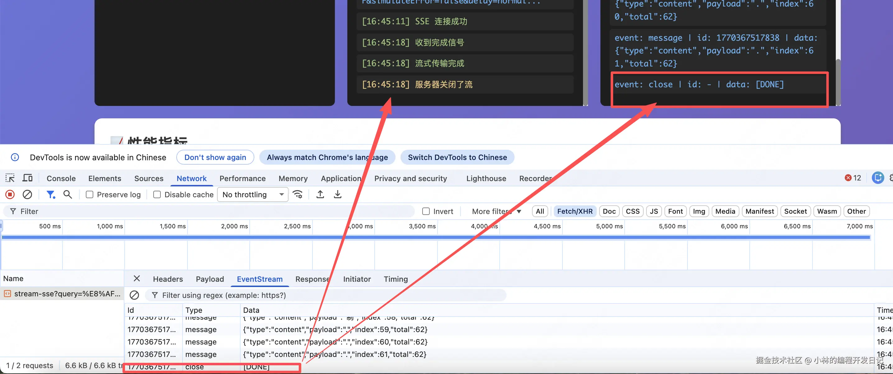 以前我以为是前端用 setTimeout 模拟的,直到有一次网络抖动,我发现它居然能从断开的地方继续输出,而不是重新开始。这就像看直播卡顿后,会自动从卡住的地方继续播放,而不是重播一遍。