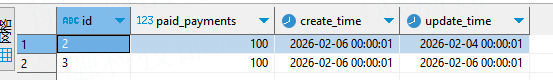 select t.id , t.paid_payments , t.create_time , t.update_time, 'U' as op_type