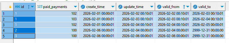 SELECT t.id, t.paid_payments, t.create_time, t.update_time,t.update_time AS valid_from, TO_DATE('9999-12-31') as valid_to