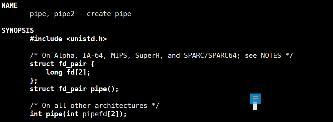 所需头文件就是 #include <unistd.h>。其中我们只要看 pipe,里面传入pipefd,pipefd 是一个包含两个 fd 的数组,代表一个管道的"入口"和"出口"。pipefd:像是一根单向的水管。你必须从一头倒水(写),从另一头接水(读)。