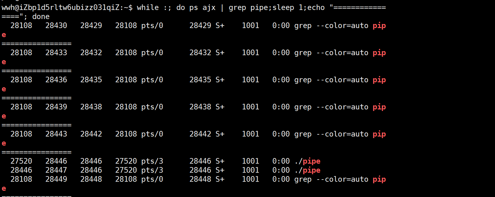刚刚我们的实验让子进程它每次写入都等个1秒钟,父进程会出现一切正常,等每次子进程写入之后,他才会写入,这也体现了,这管道通讯的同步性。