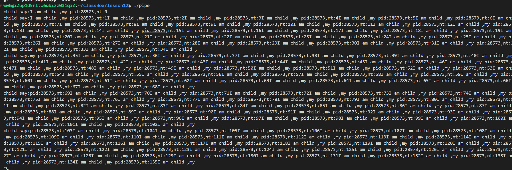 每次1秒钟读出来的都是不一样的。如果子进程写入很多次,那么缓冲区被挤满了,写不进去,子进程是被阻塞的,直到父进程读取,才能释放,子进程才能继续写。
