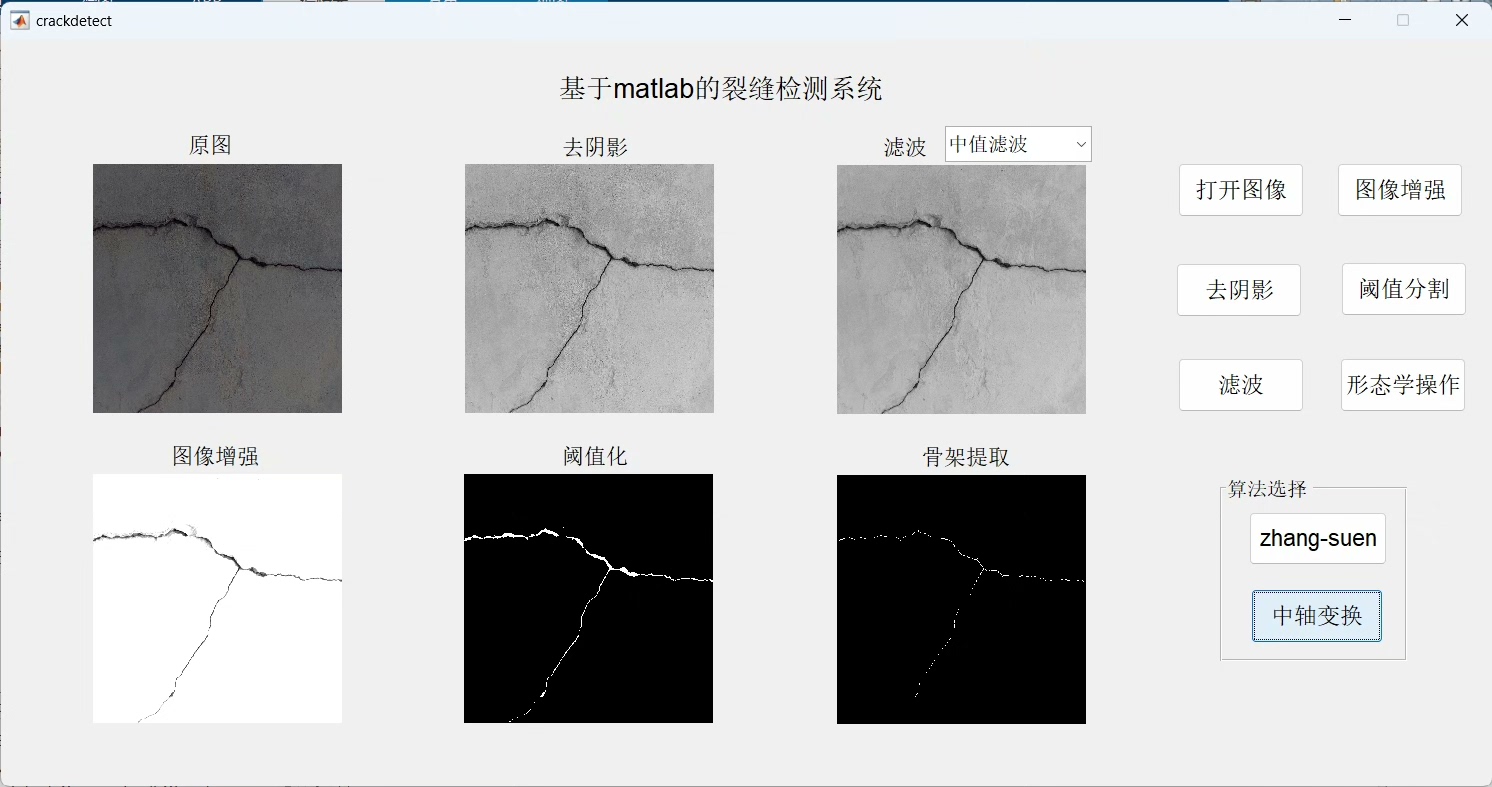- 标题: 基于matlab的裂缝检测系统 - 关键词:matlab GUI界面 数字图像处理 去除阴影 滤波 图像增强 大津算法 otsu zhang_suen算法 形态学操作 骨架特征提取 中轴变化 - 步骤:打开图像 去除阴影 滤波操作 图像增强 阈值处理 形态学操作 骨架提取 - 简述:使用数字图像处理技术对输入图像去阴影操作,并可选择使用:中值滤波,均值滤波, 高斯滤波三种算法,之后再对图像进行增强操作,阈值化的大津算法,以及对阈值处理后的图像进行形态学操作,最终使用zhang_suen算法或者中轴变化算法,骨架效果提取明显,能保持裂缝的总体结构不变化且连续。