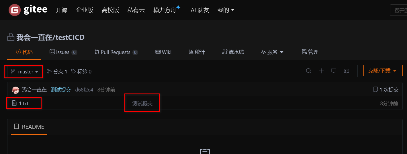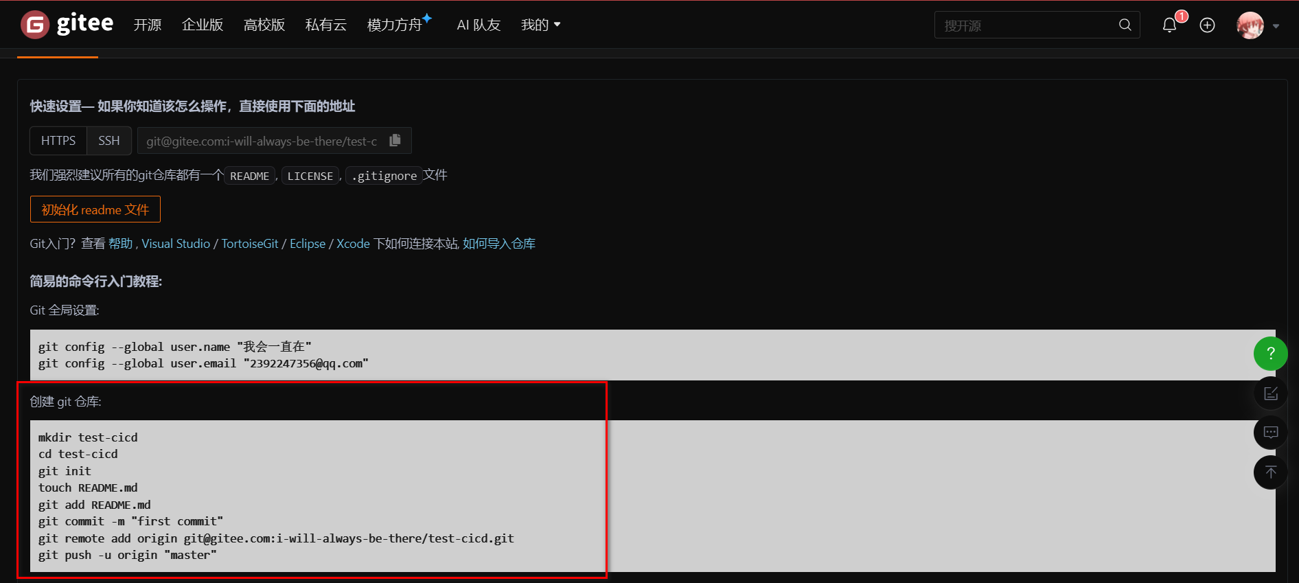 git remote add origin https://gitee.com/i-will-always-be-there/test-cicd.git # 绑定远程仓库