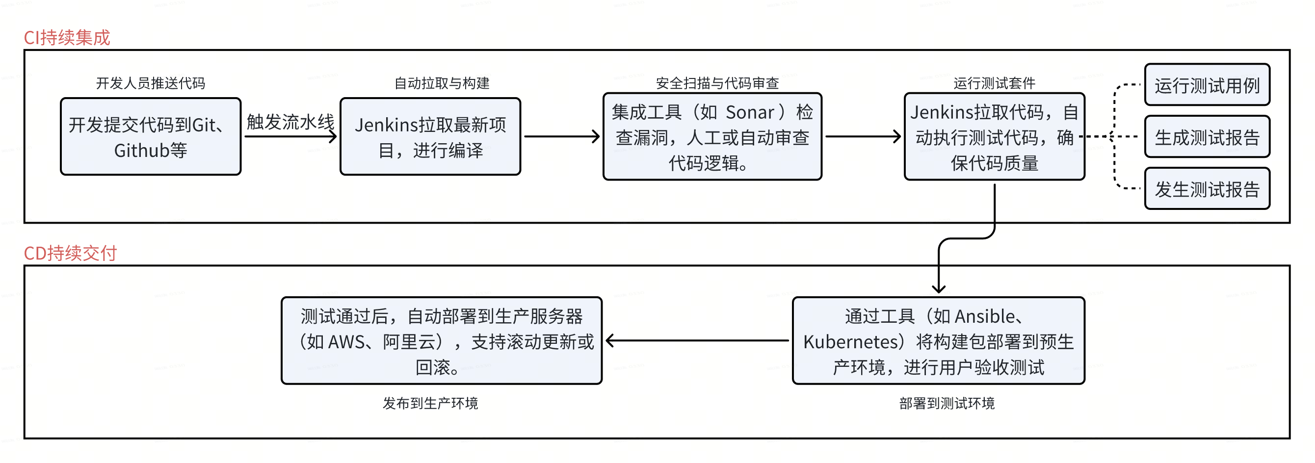 - CI/CD(持续集成/持续交付)自动化部署流程的核心是通过工具链自动完成代码提交、构建、测试和发布,减少人工干预,提升软件交付效率。