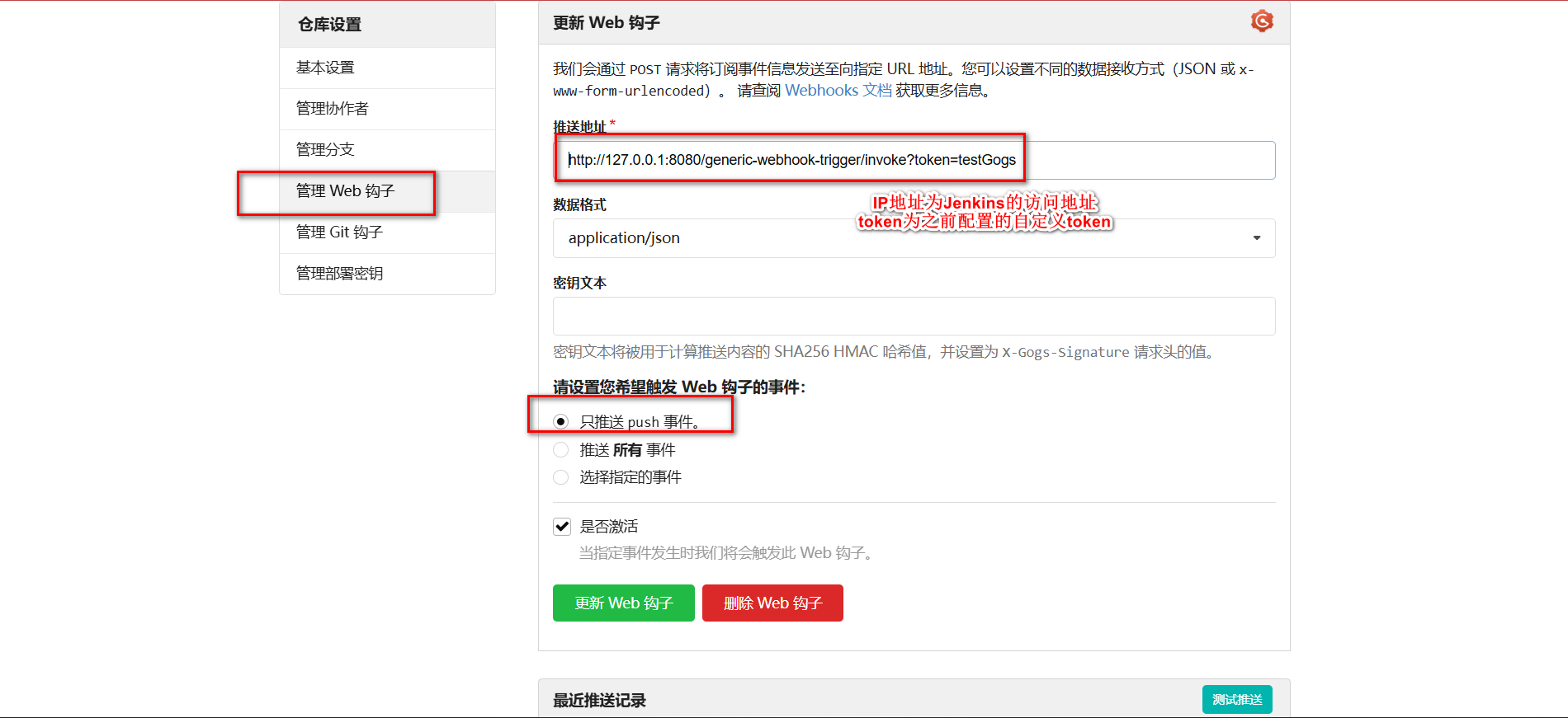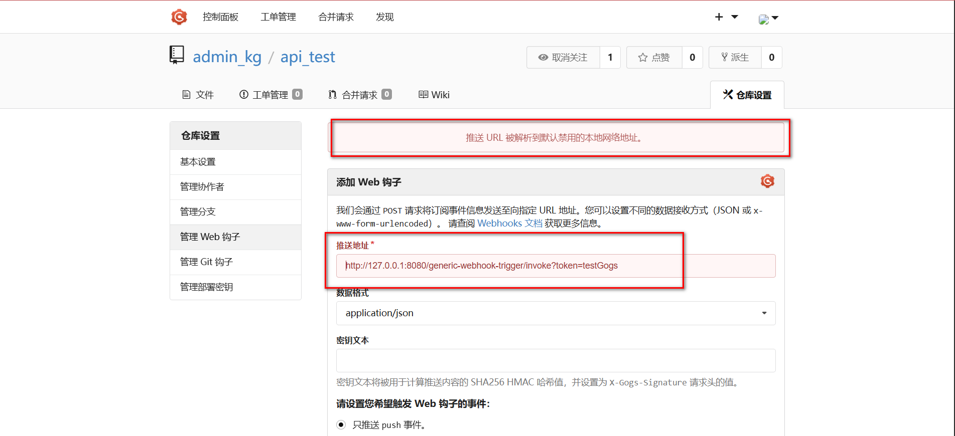 仓库设置 --- 管理钩子 --- 添加新的钩子(Gogs)