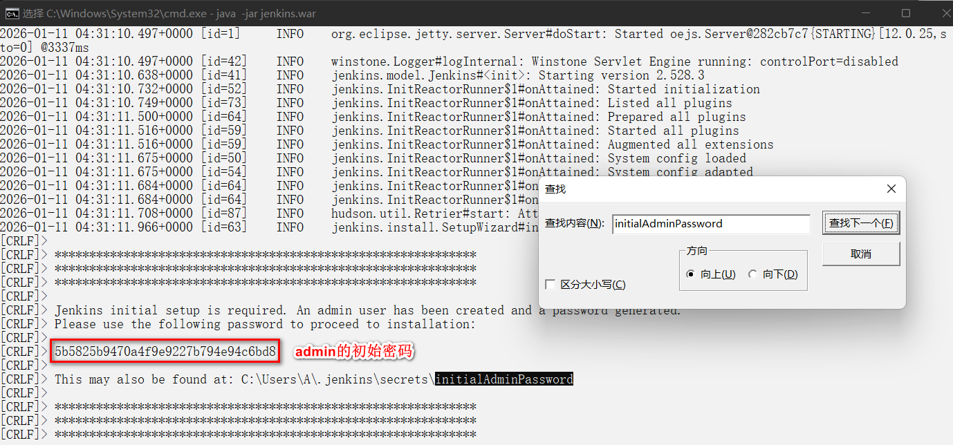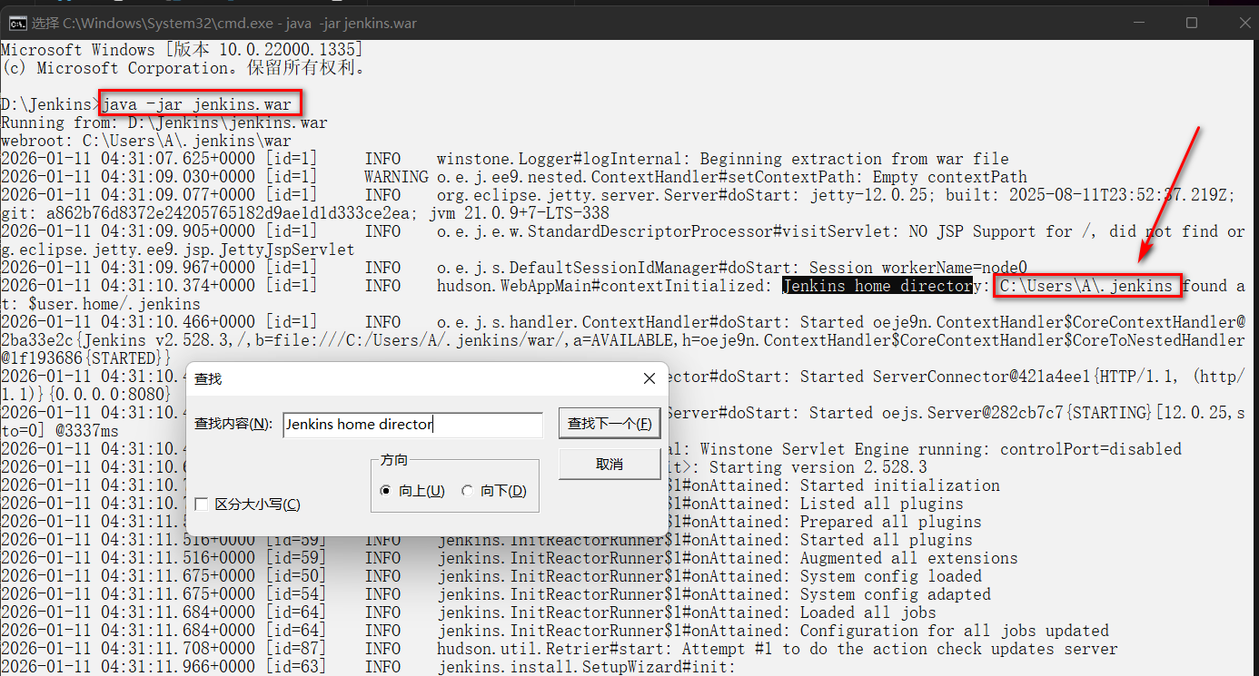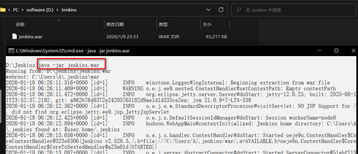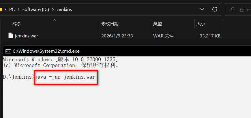 找到Jenkins.war的路径,并在改路径下进⼊cmd或者终端