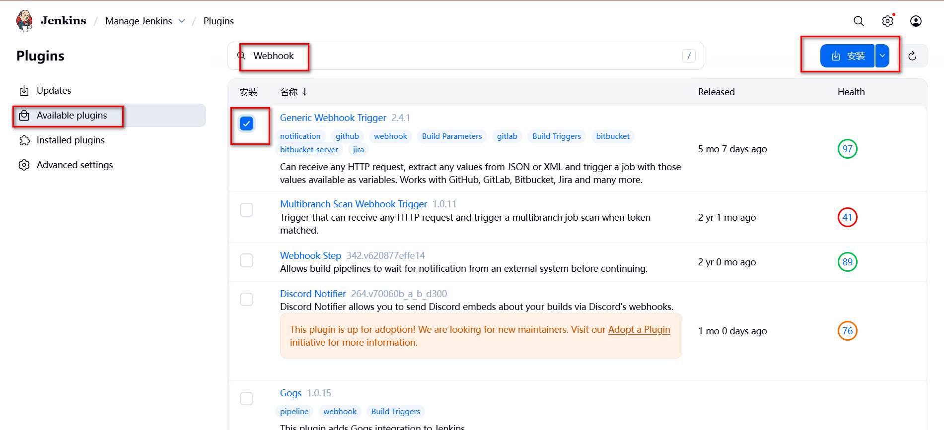 设置 --- 插件管理 --- 可选的插件 --- 搜索"Webhook"