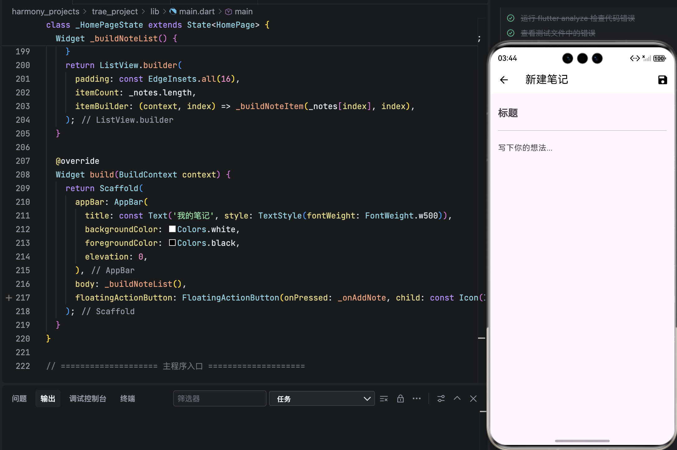 在移动应用开发的学习路径中,记事本(Notes App) 常被视为"Hello World"级别的实战项目。它虽简单,却完整覆盖了 数据建模、状态管理、页面跳转、用户交互、UI 规范 等核心技能。而当我们将其限定在 Flutter + OpenHarmony 平台,并遵循 鸿蒙设计语言(HarmonyOS Design) 时,更需关注 简洁性、留白感与圆角美学。