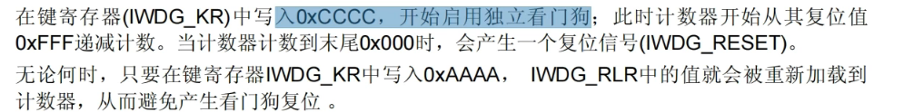 写入0xCCCC到键寄存器(IWDG_KR) :这是启动独立看门狗的指令