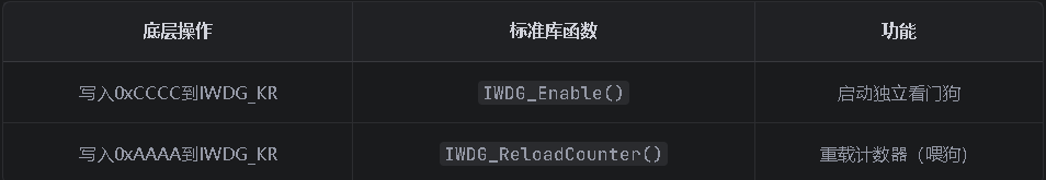 IWDG_ReloadCounter(); // 喂狗(写入0xAAAA)