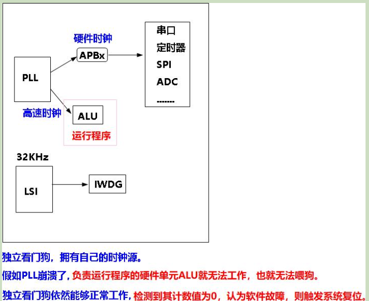 独立时钟源 :使用内部低速振荡器(LSI,约32kHz),即使主时钟故障也能工作
