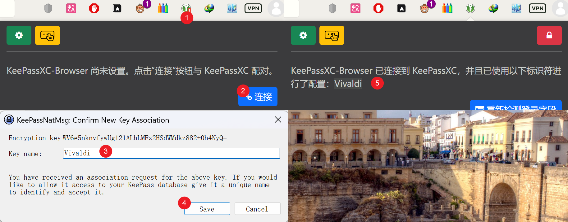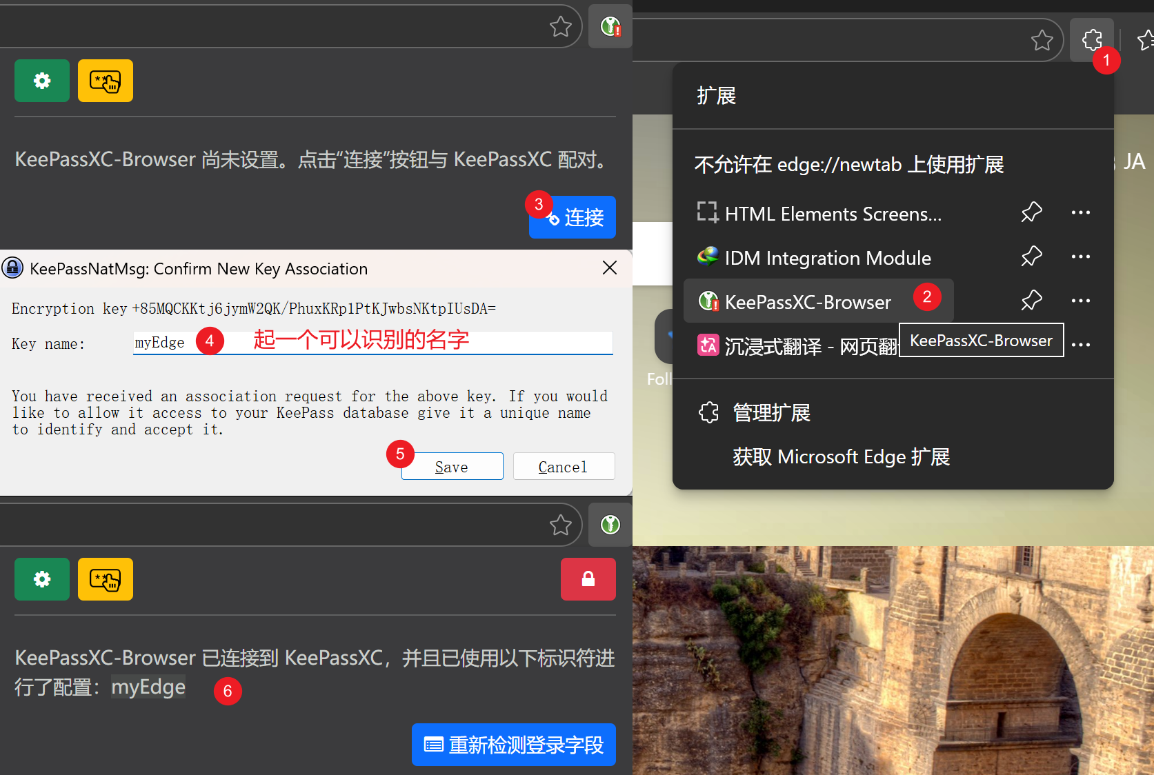 👉插件安装完成后,点击插件图标,即可设置与Keepass 的连接,在Edge 浏览器中的设置过程如下👇: