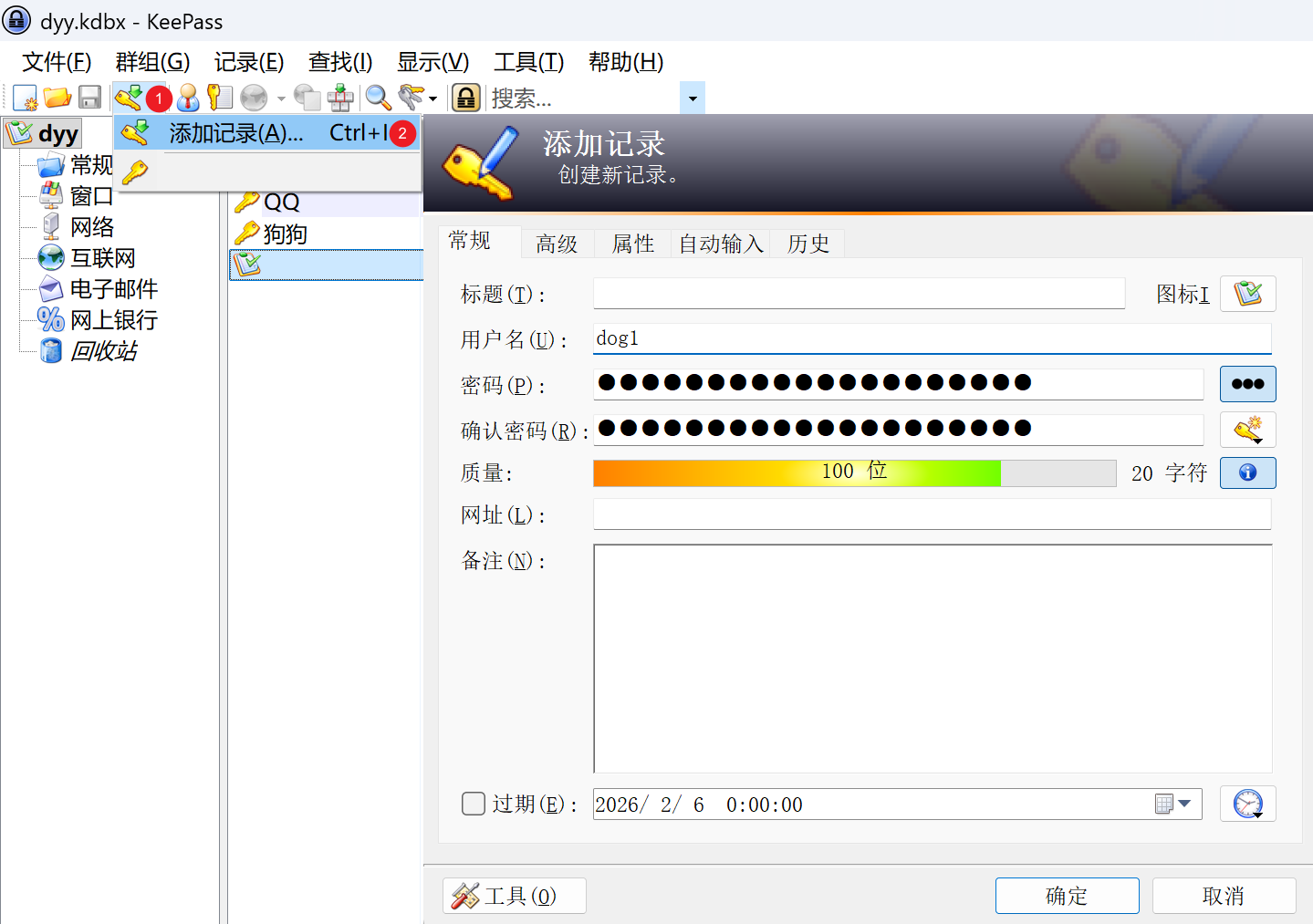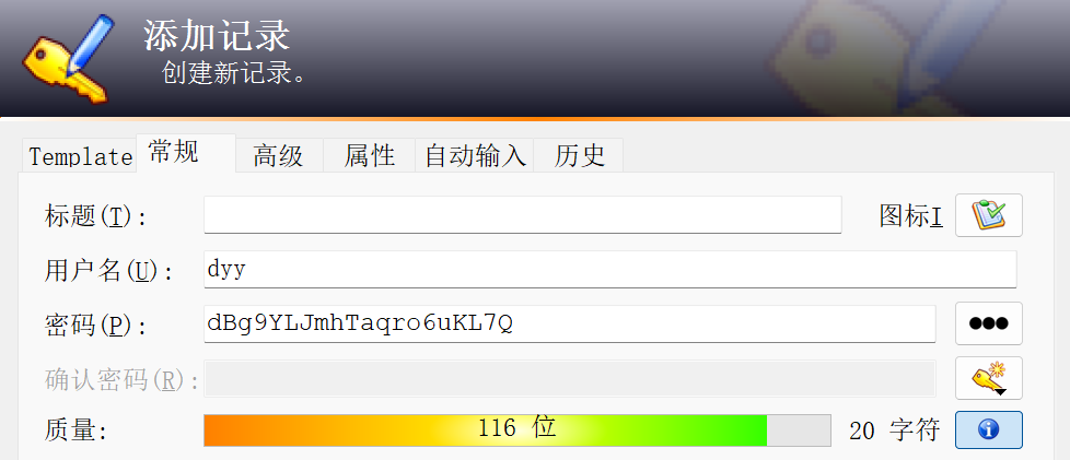 当我们注册某一账户时,需要生成一个新的密码以供使用,Keepass 在创建新的记录时,会自动的生成一个新的密码以供我们注册时使用,如下👇:
