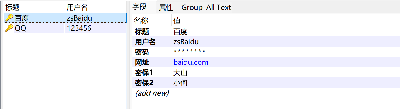所以,我们在创建密码记录时,需要考虑到Keepass 的匹配机制,以便Keepass 可以准确的找出我们需要的密码记录。例如你为百度账户创建密码记录时,如下的设置将更容易在百度各应用/平台上检索到本条密码记录: