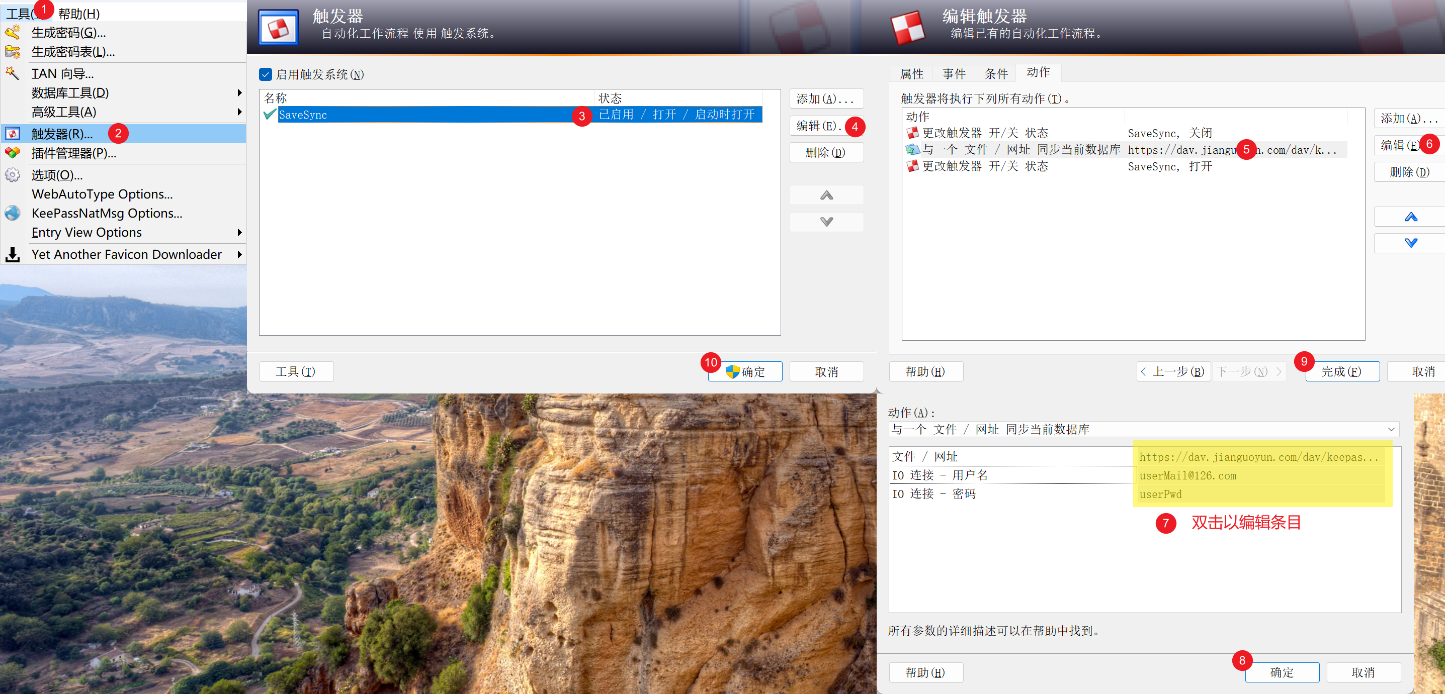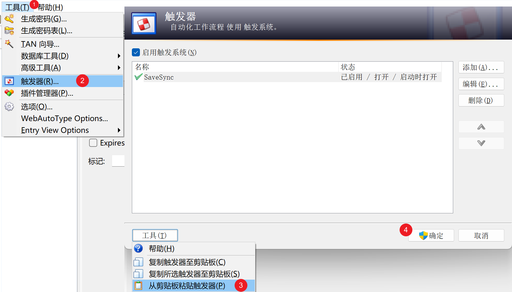 复制了触发器脚本后,将触发器配置到Keepass 中,如下👇