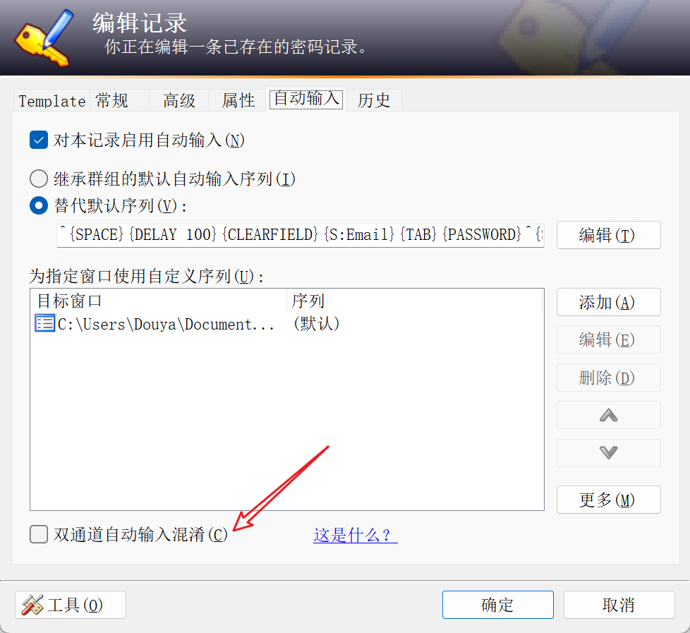Keepass 在键入用户名和密码时,是通过模拟按键进行键入的,那么如果你的电脑已经中毒,中了木马,他可以监视并获得你通过键盘键入的字符,那是不是Keepass 键入的内容就被这个木马截获了?为了应对这个场景,Keepass 支持在键入操作时,引入剪贴板渠道。意思就是说,Keepass 将要输入的内容随机的截成n段,其中一部分通过模拟键盘键入,另一部分先放入粘贴板,然后再通过Ctrl+V 粘贴到输入框中,这样木马程序只能观察到使用了Ctrl+V 操作,但无法得知粘贴的内容,从而提高了密码键入的安全性。我们可以在创建密码时,在〔自动输入〕标签下的下方看到〔双通道自动输入混淆〕选项,如下👇: