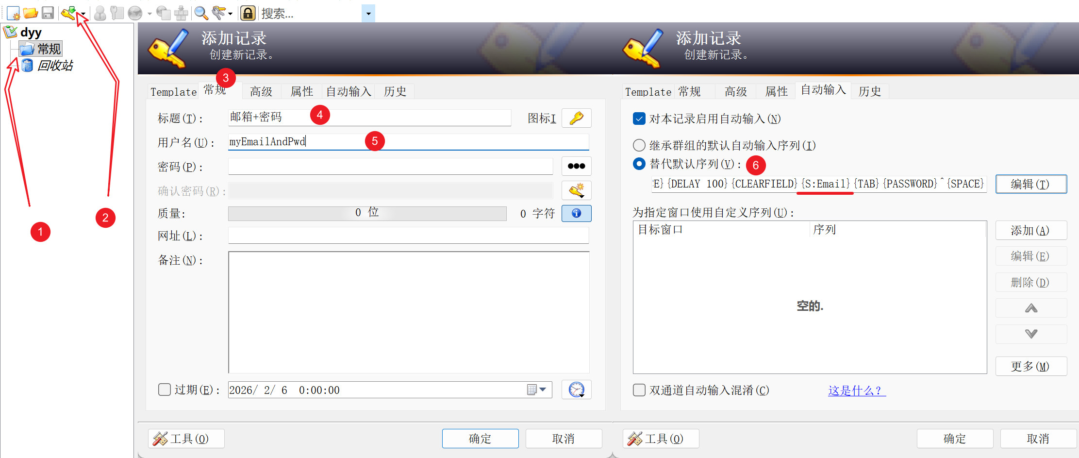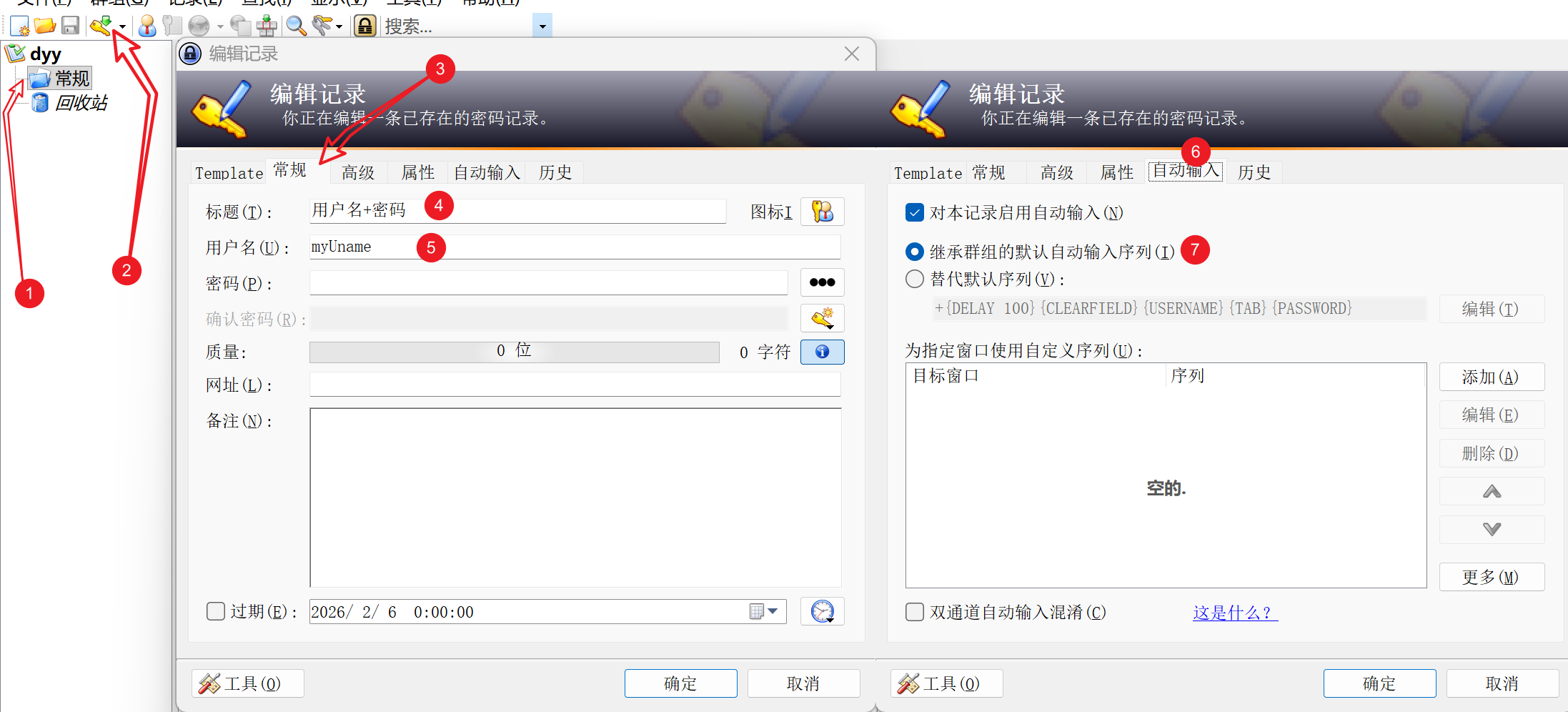 - 选中〔常规〕群组,添加记录,设置标题和默认用户名,设置键入模式: