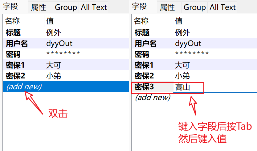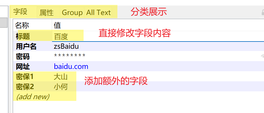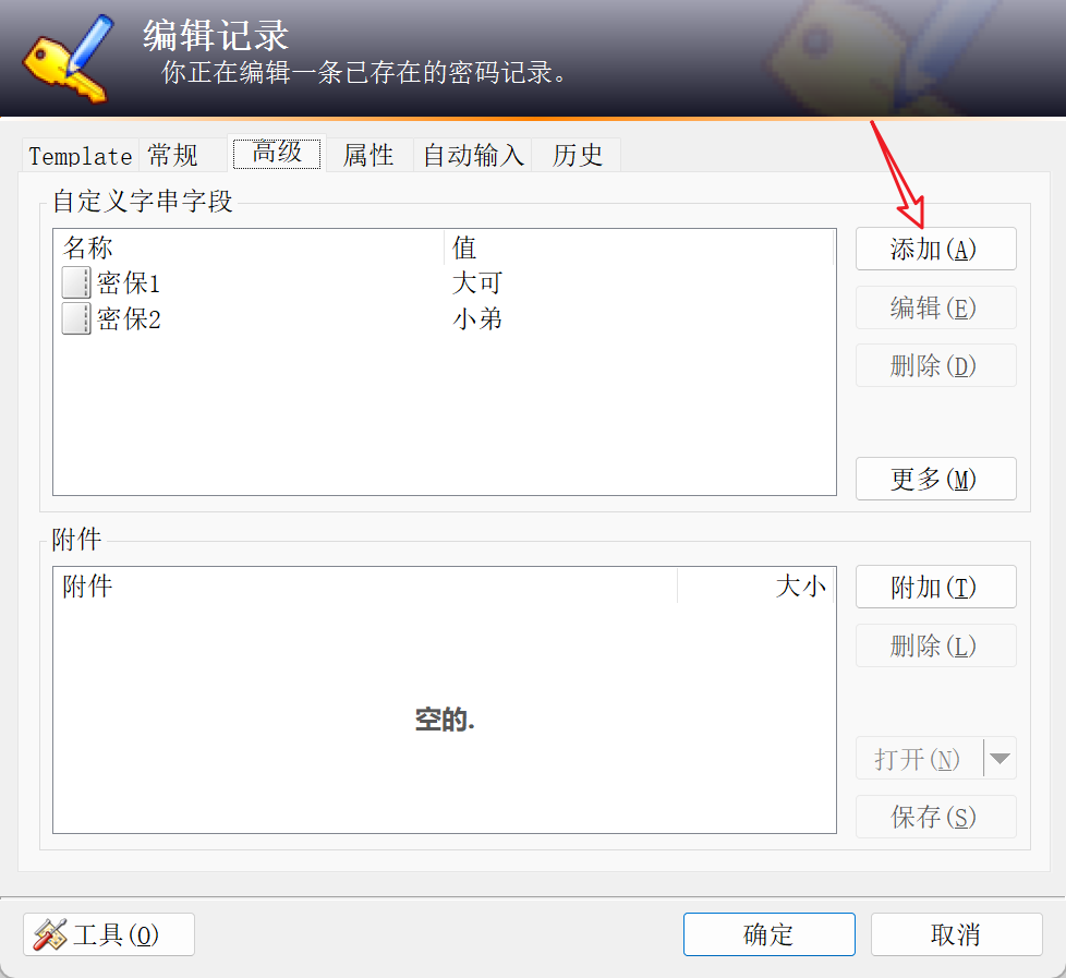 各个平台对于密码的要求千奇百怪,我们很难完全预料到所有的记录需求场景;或者如果尽可能的覆盖各种各样的排列组合的话,我们的模板将变得繁多又复杂,所以对于模板的设计,我们应该保持有所克制,抽取必要的,最大化的需求制作模板,而对于小众的,我们通过〔高级〕标签下的〔自定义字串段〕来添加额外的字段及对应值,如下👇: