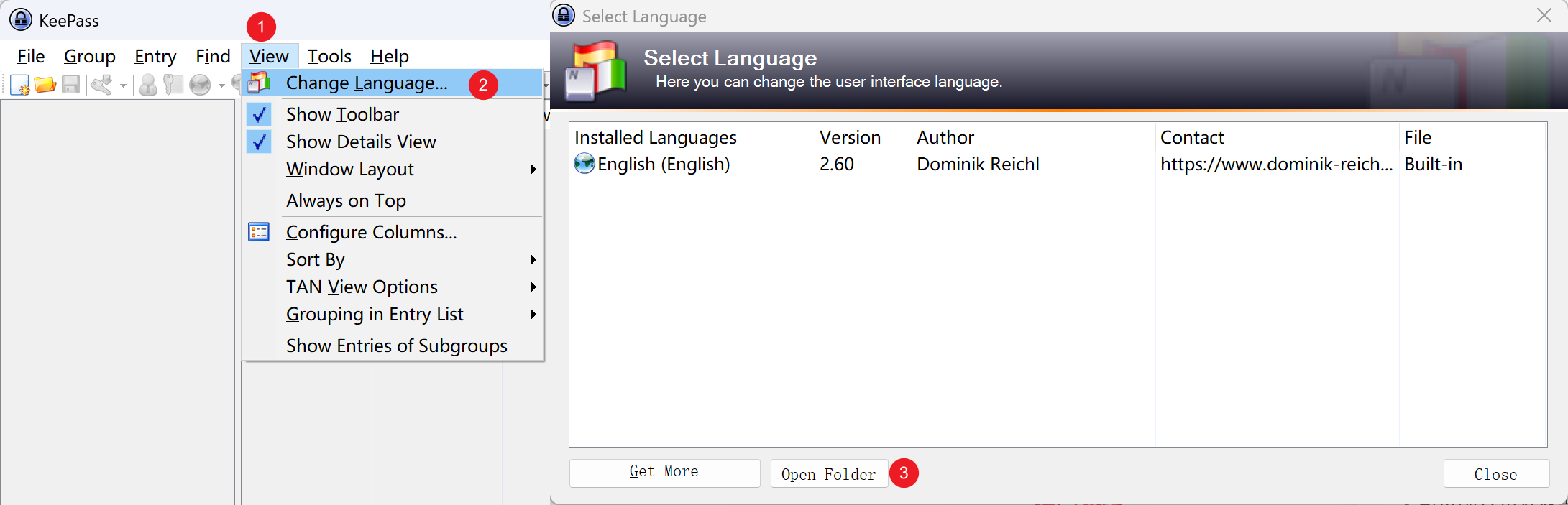 Keepass 安装后(Portable版本不需要安装),打开界面是英文界面。此时通过〔View〕/〔Change Language〕/〔Open Folder〕打开语言包文件夹,如下👇