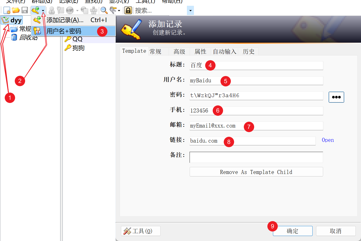 手机-密码模板用于记录那些可以通过手机+密码登记的密码项目。操作如下👇: