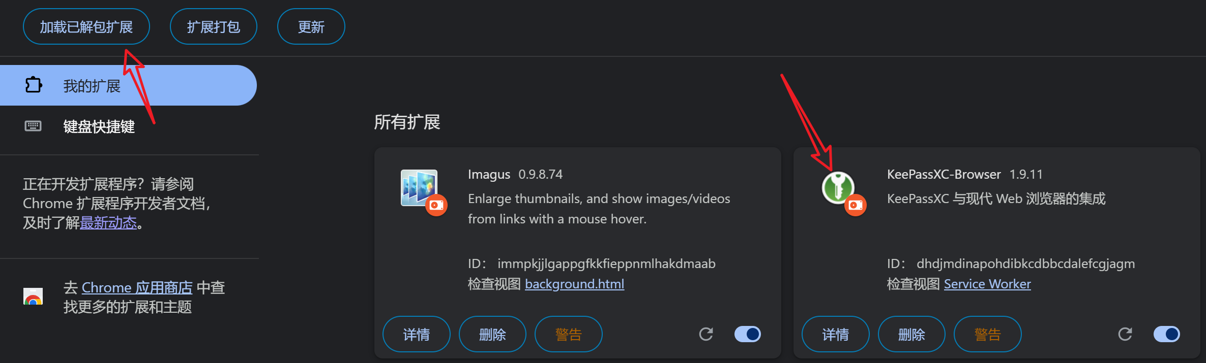 👉你可以将zip 解压后,通过浏览器加载KeePassXC-Browser 插件,如下👇: