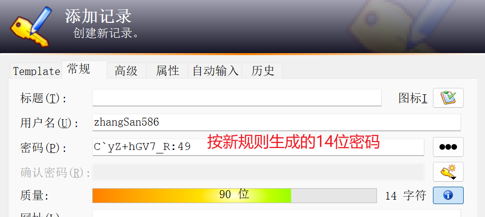 经过以上设置之后,我们在新建记录时,Keepass 便可以根据我们刚才的设置规则生成新的随机密码了,如下👇: